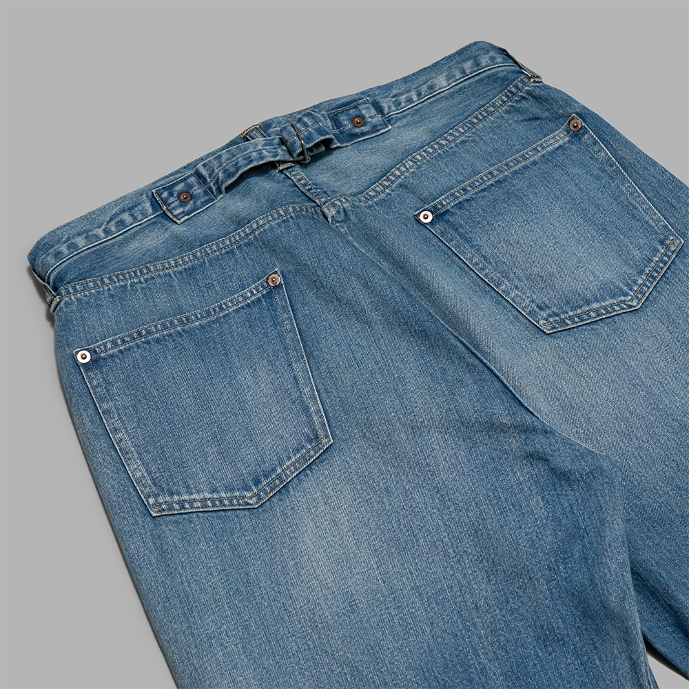 デザインは、1922年モデルの501XXをベースに、バランスを整えた太めのシルエットで作られています。上流階級だけではなく若い労働者階級にもベルトが普及した時代でもあり、この年から初めてベルトループが採用されています。それまでのシンチバックやサスペンダーボタンも残され、変換期ならではの多種多様なディティールを備えています。前立てはボタンフライの仕様です。