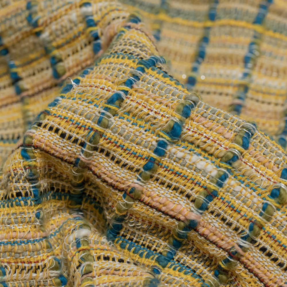 インド背景でオリジナルで作り込んだファンシーなスラブコットンツイードを使用しています。コットンをベースとした素材使いにより、ツイードでありながらも、ソフトなタッチ感としなやかさが特徴です。ふっくらとした織り目と多彩な糸の組み合わせは、立体的な表情になり、ナチュラルな風合いを際立たせてくれます。