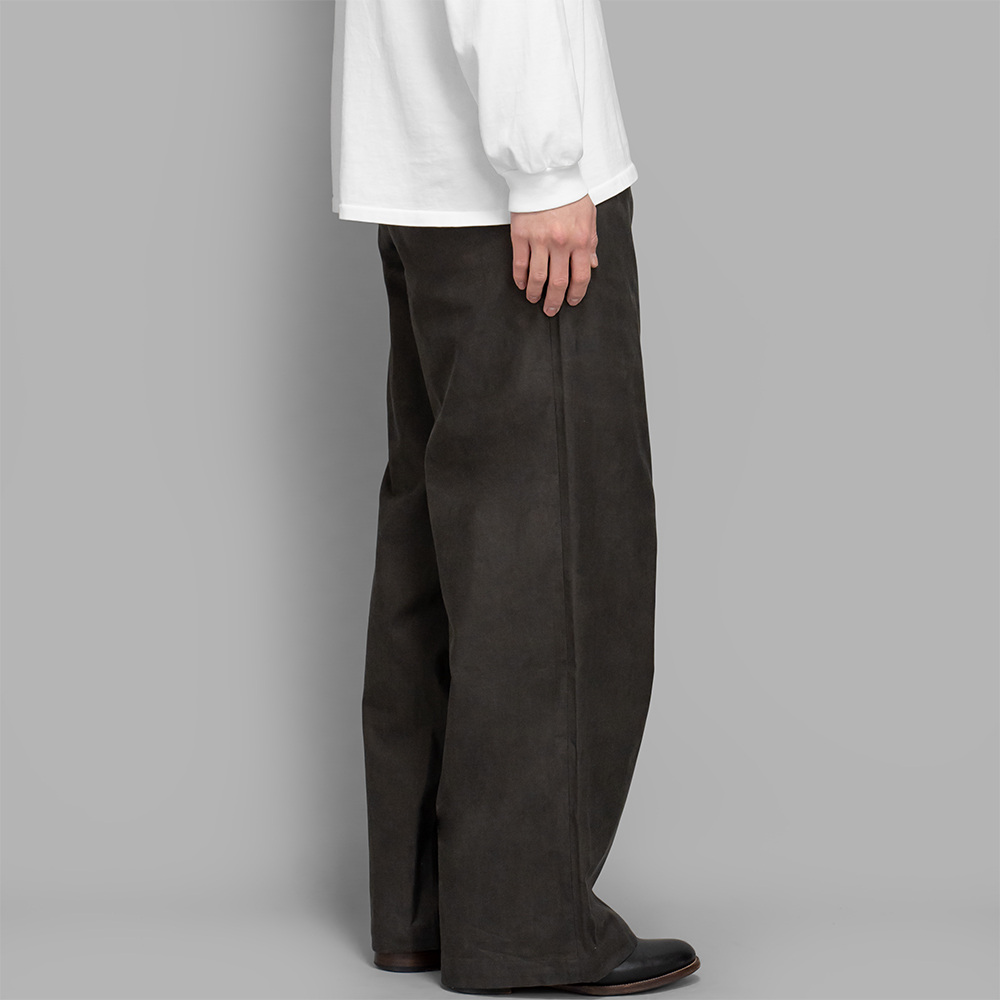 生地は、コットンを使用した薄手のバックサテンに、墨汁コーティングとワッシャー加工を施し、エイジングしたような風合いと奥行きのある色合いに仕上げた素材を使用しています。ライトウエイトな履き心地でありながらも、シャツやカットソーをシンプルにあわせるだけで、雰囲気のあるスタイルを作れる素材です。
