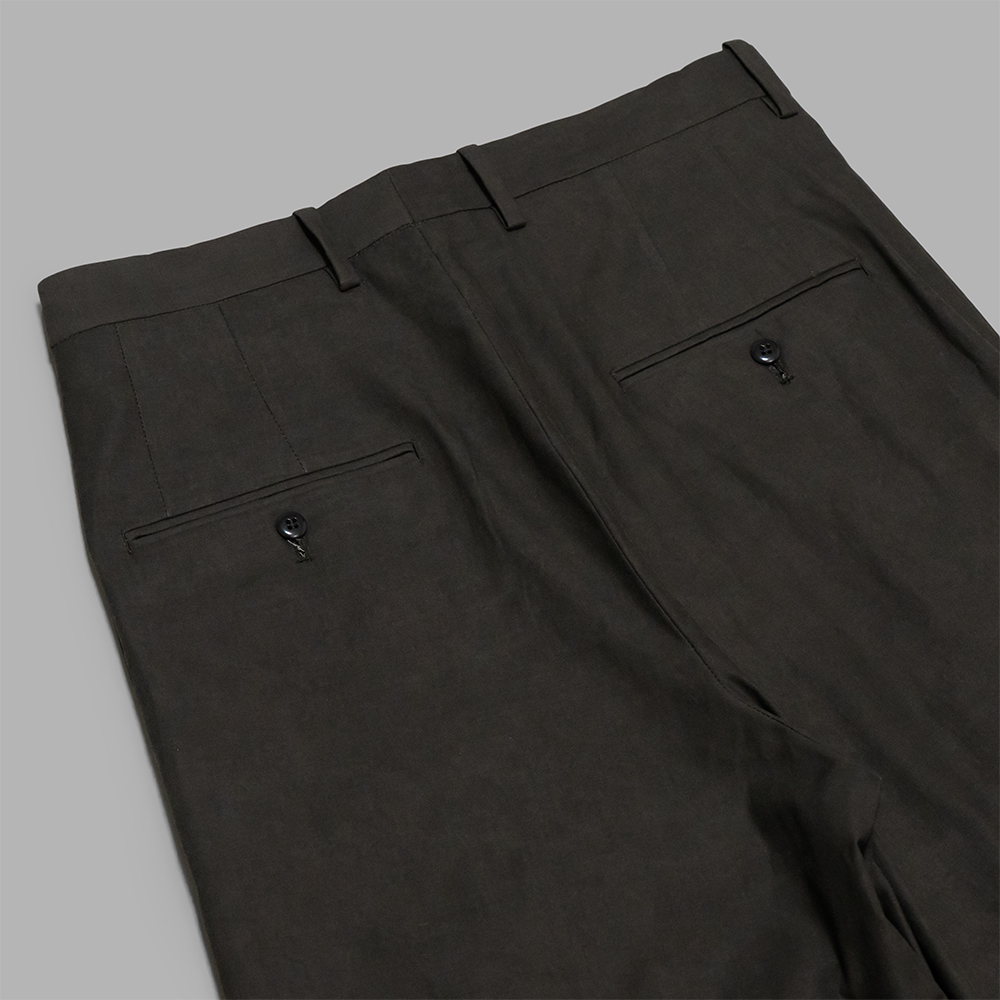 ウエストを隠して着用することで、チノパンのようにみえるカジュアルさを加味したアイテムとなっており、前立てはジップフライ、裏地のない一重の仕様で、ヒップポケットは両玉縁で丁寧に仕立てられています。