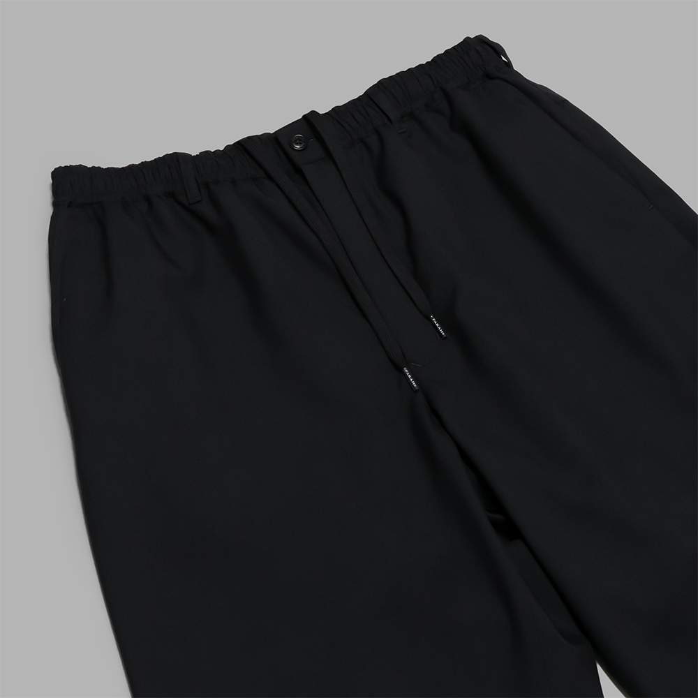 型は、ワイドシルエットのイージーパンツです。腰回りはドローコードとゴムを通した仕様で作られており、ベルトレスでの着用もできますが、ベルトループも付いていますので、ベルトを通して着用することも可能です。また、使いやすさとデザインのバランスを取るため、ポケットの形状の抑揚を控えめに調整しています。前立てはジップフライ、裏地ない一重の仕様です。