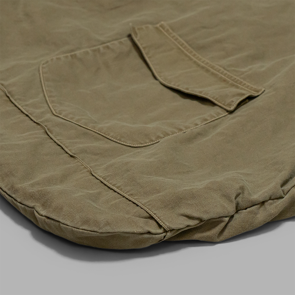1970年代のUSヘルメットバッグと1980年代のUSトートバッグの形状をリファレンスに設計しており、表面には大きなフラップポケット、内側には2つの収納ポケットを配し、機能性と個性を両立させています。バッグの袋部分には手作業でシャーリング(ギャザー)を入れ、経年変化による収縮を再現しています。