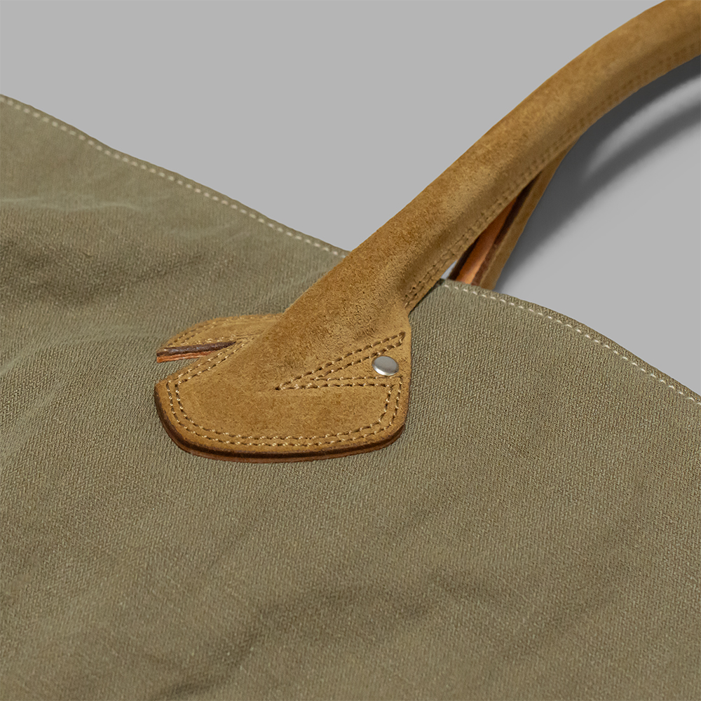 素材は高混率リネン綿混紡単糸を使用しています。製品加工で自然なシワ感と生地の擦れ感を引き出すことで、よりリアルなエイジング感を表現しています。ハンドル部分にはカウレザーのスウェードが採用されています。