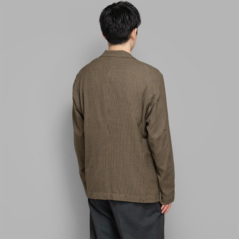フランスのテーラードスタイルとイギリスのダブルブレストジャケットをリファレンスとしオリジナルパターンで製作されています。袖は立体的な一枚仕立てとし、ボタンの掛け位置で表情を変えられる設計も魅力の1つです。前面には3つのパッチポケットとチェンジポケットがつく仕様に、中にも2つのポケットがつき、実用性も兼ね備えています。また、中には引っ張りがついているため、ボタンに留めて着用も可能です。