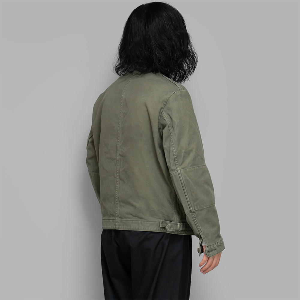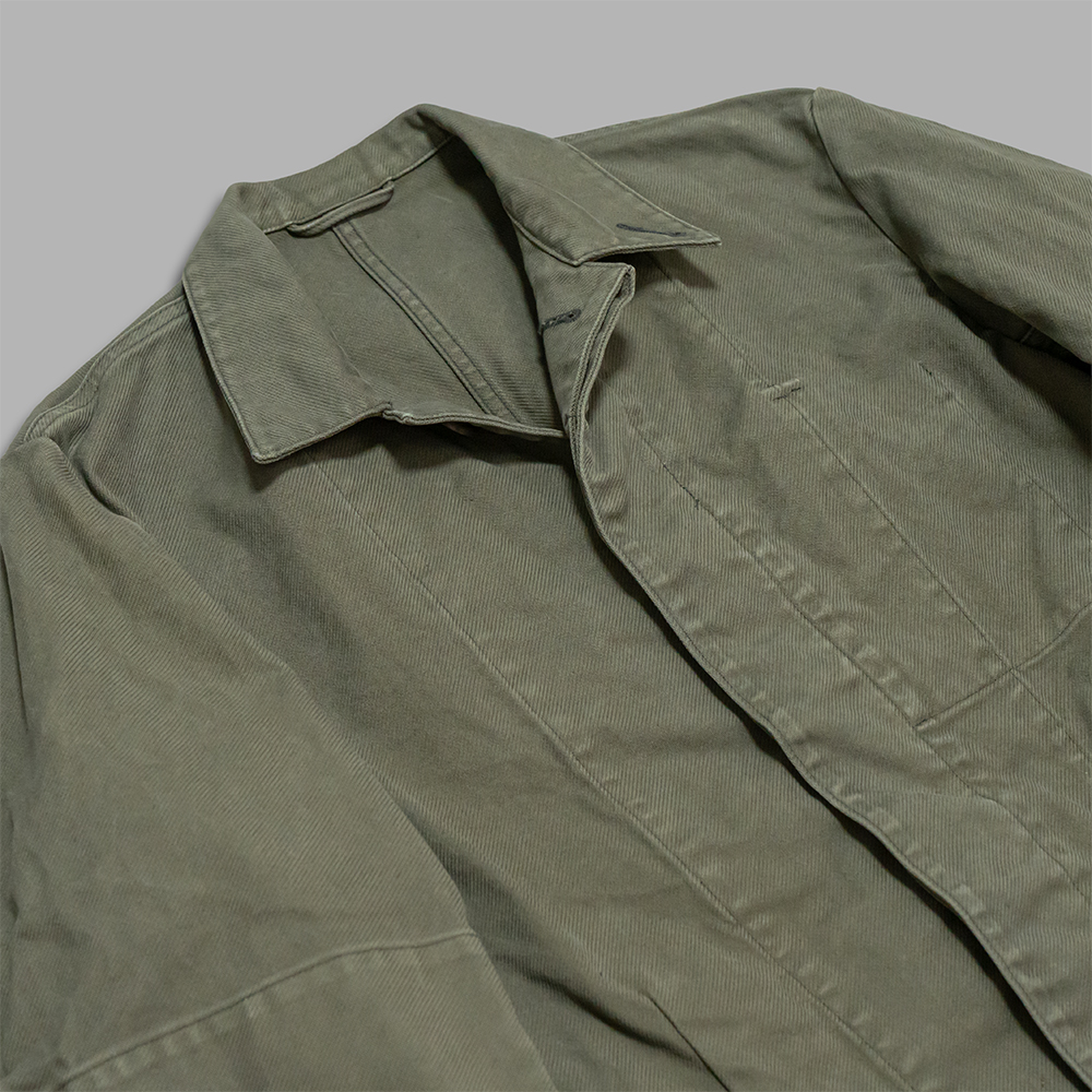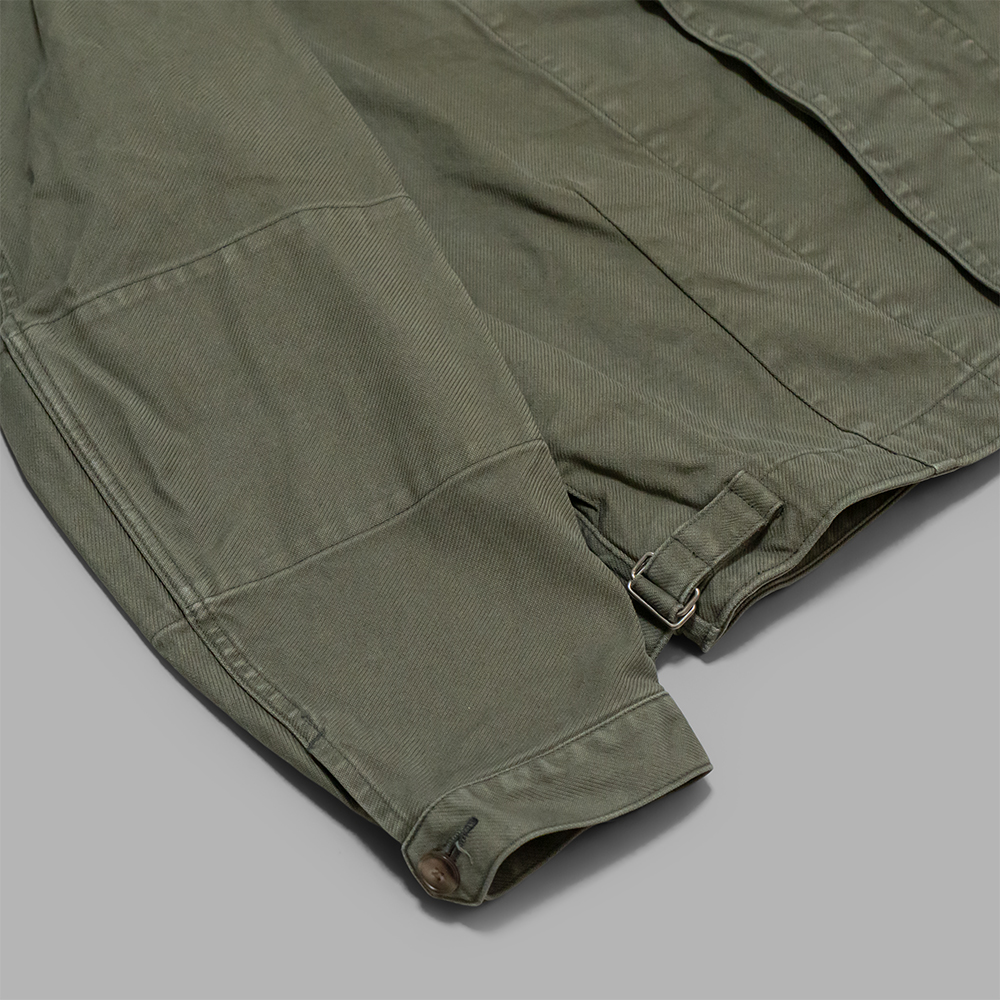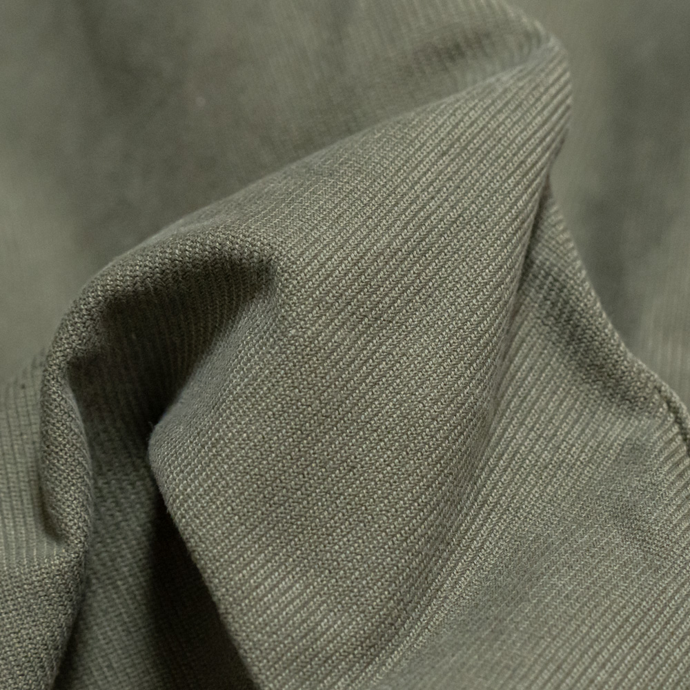 スペインのファブリックメーカーのハイカウントなコットン素材を使用しています。製品染めと加工を施すことでミリタリーらしさのある風合いを演出しています。控えめな光沢感は上品な印象を与えながらも、適度なハリ感やタフさも感じられる魅力ある素材に仕上がっています。