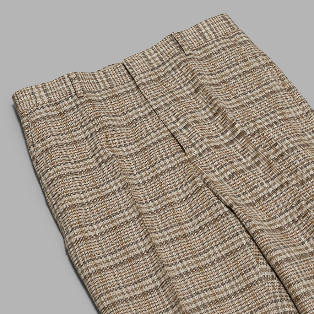 同ブランドらしさのある多色使いのチェックにより、生まれる奥行きのある色合いはこの素材ならではの魅力です。さらっとシャツを羽織るだけで上品さがうかがえ、春夏の暖かい時期でも快適に着用できるボトムスです。