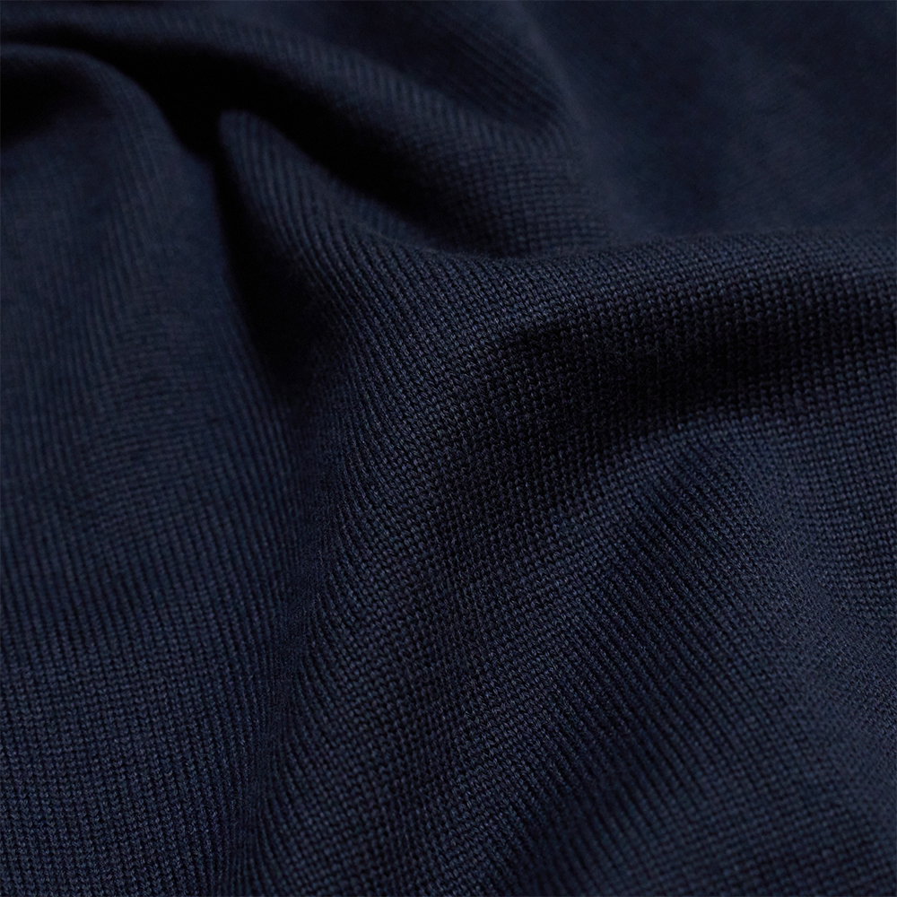 上質な細番手のコットン糸を4本取りすることで、しっかりとした肉感を備えながら、しっとりとした滑らかさと光沢のある素材に仕上げています。体のラインが出過ぎないよう、14ゲージの度詰めで編み立てていることもポイントです。