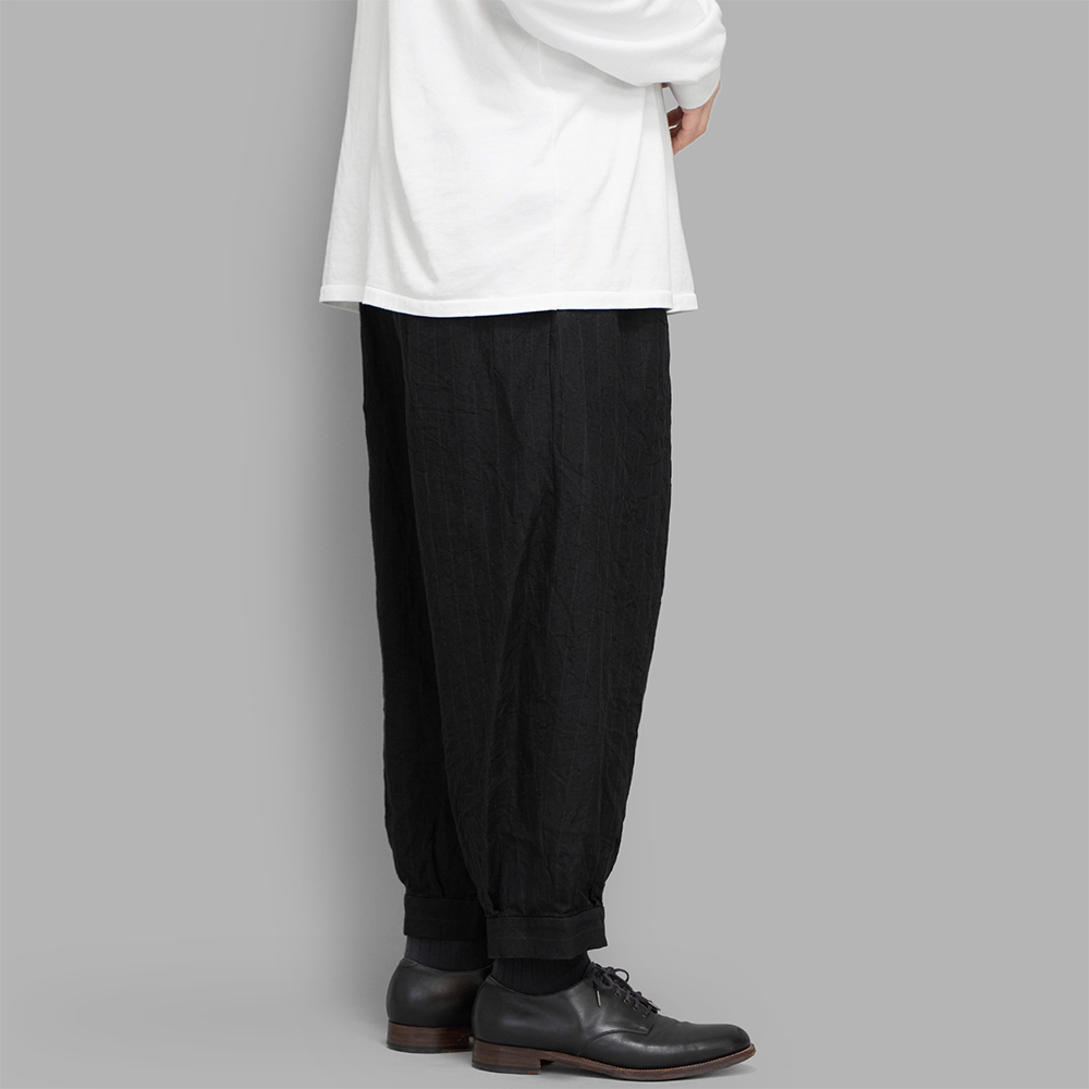デザインはディティールを抑えながらも、シルエットで特徴をもたせています。イン・アウトで使い分けた2タックによる腰回りのボリュームと深めに取られた股上。裾は絞り、丈は九分丈で短めに設定することで、特徴的なシルエットに仕上げています。前立てはボタンフライで、中は裏地のない一重の仕様です。