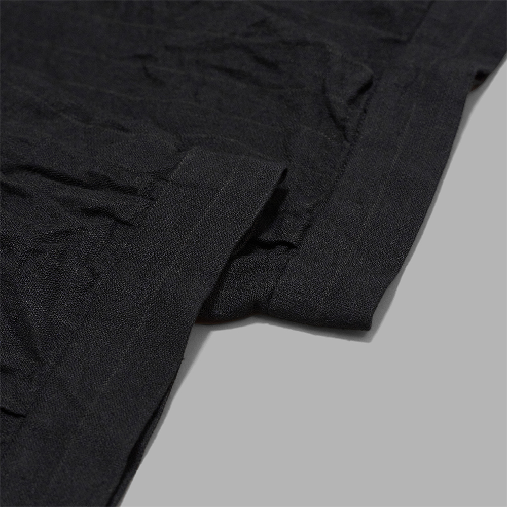 素材は、奥行きを感じられる底深い色調が魅力のストライプ柄のリネン素材を使用しています。強撚したリネン素材をヘリンボーン組織で織り上げることで、素材感の力強さを感じられますが、軽やかな生地感となっており、ドレープとハリが共存する生地に仕上がっています。