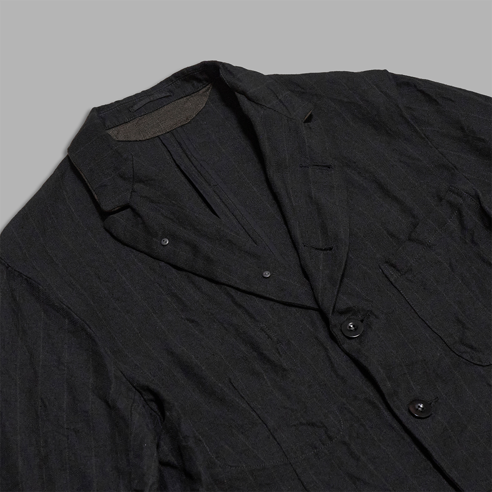 素材は、奥行きを感じられる底深い色調が魅力のストライプ柄のリネン素材を使用しています。強撚したリネン素材をヘリンボーン組織で織り上げることで、素材感の力強さを感じられますが、軽やかな生地感となっており、ドレープとハリが共存する生地に仕上がっています。