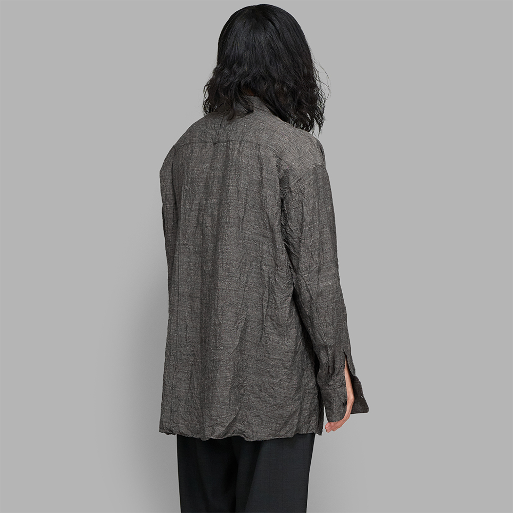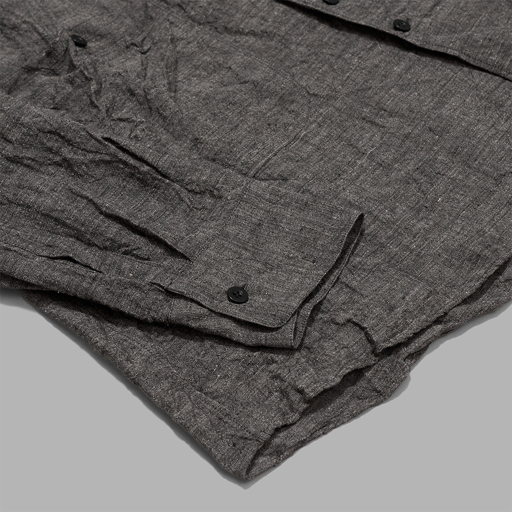 素材は、東洋とも西洋とも見える古い色調を目指したリネンを使用したシャンブレー生地です。太番手糸を程よく甘織りで織り、仕上げに製品加工を施すことで、空気を含んだかのような軽やかな生地感に仕上げています。
