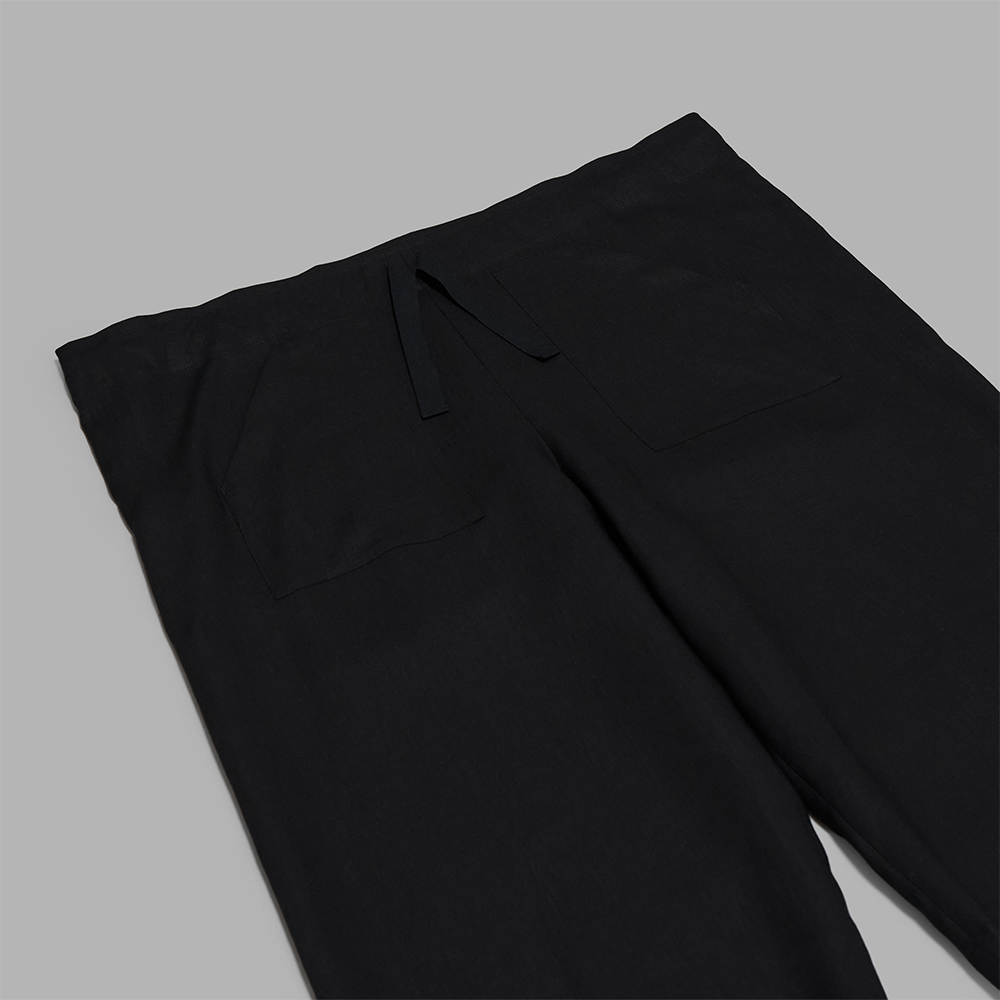 型はウエスト紐で調節するのみのルーズパンツです。広げた際にフラットになるような、シンプルなパターンでありながらたっぷりと取った生地によって、着用時に雰囲気のあるシルエットを生み出してくれます。