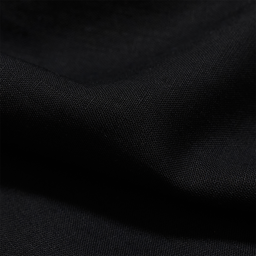 素材にはリネンを高密度に織り上げた平織り組織の生地を使用しています。原料の特性である、ネップ感やドライなタッチがありながらも、薄くしなやかな質感が特徴的です。