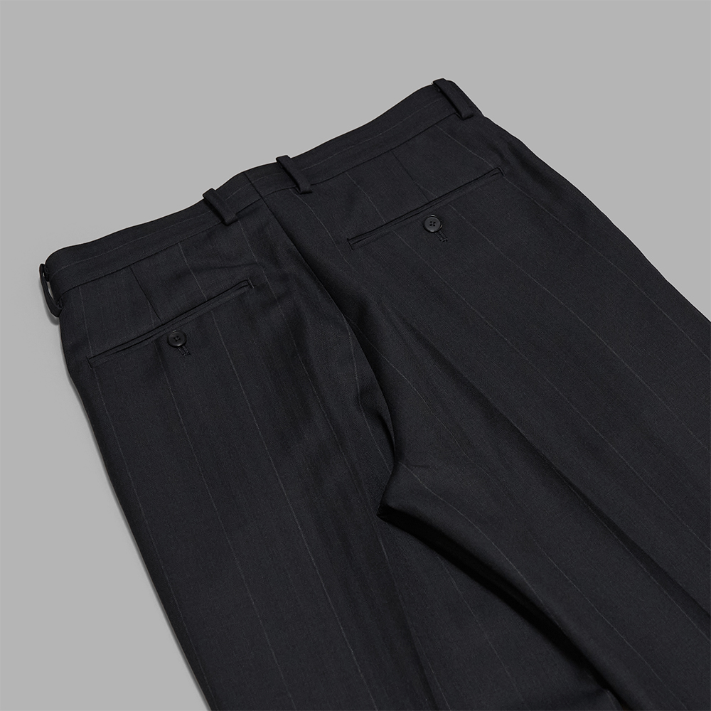 型はツータックのトラウザーで、腰回りに適度なゆとりをもたせ、膝下から裾にかけて緩やかにテーパードの入ったストレートシルエットです。前立てはジップフライ、腰裏はマーベルト、ヒップポケットは両玉縁で丁寧に仕立てています。中は半裏の仕様です。