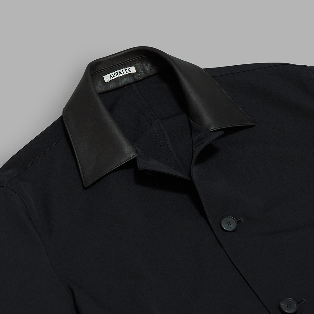 型は、身幅やアームホールなど全体的にリラックスしたサイズバランスで製作されたロングコートです。チンストラップや袖ボタンなどの装飾を削ぎ落としたベーシックなデザインは、素材や仕立ての良さが際立つアイテムとなっています。表面の襟元にはラムレザーを採用し、ハリのあるウール素材のボディにしなやかな風合いのラムレザーが加わることで、力強さと柔らかさが同居する絶妙なバランスに仕上がっています。中は裏地のない一重の仕様で、内ポケットは付きません。