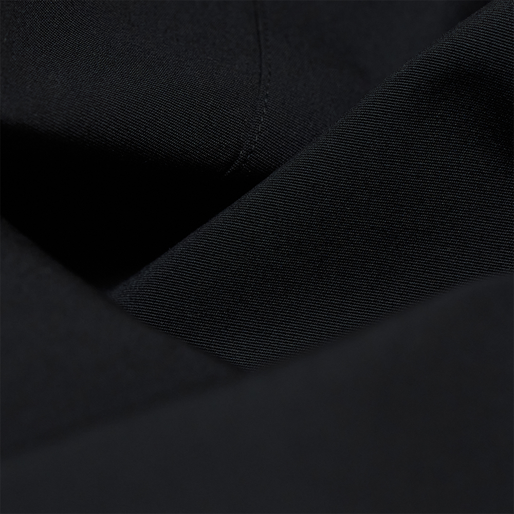 素材は、Super120'sの極細原料を使用し、限界まで高密度に織り上げたウールキャンバス素材を使用しています。繊維の細さを活かした均一で美しい織り目と、しっかりとしたハリ感が特徴です。また、高密度で織り上げることで、綺麗なドレープが感じられるだけでなく、さらっとした質感となるので、肌離れが良く快適に着用いただけます。