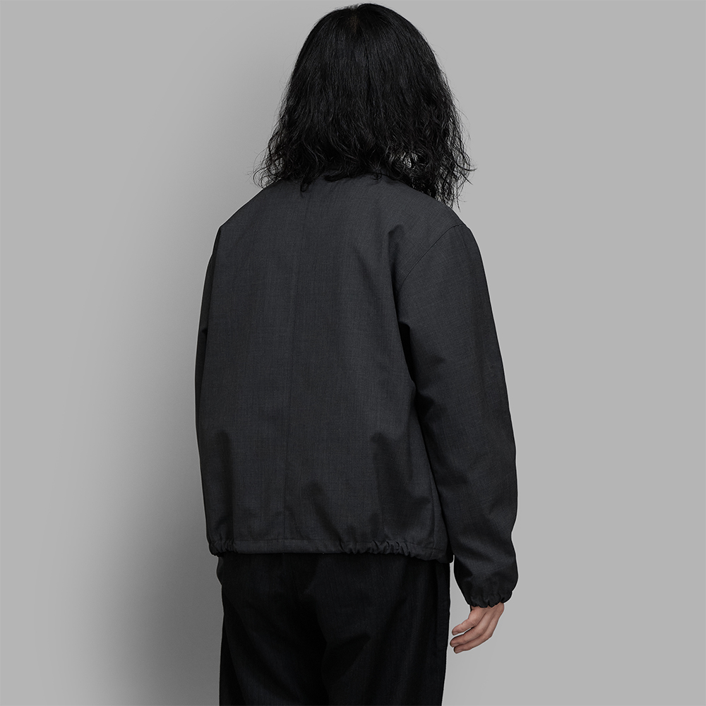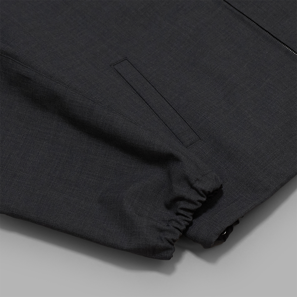 型は、身幅やアームホールに程よくゆとりを持たせたショート丈のブルゾンです。裾と袖にはゴムを通した仕様で、無駄のないモダンな雰囲気で製作されており、裾部分は両サイドのゴムを絞ることでシルエット調整ができます。ジップにはスイス創業の高級ファスナーブランドのririジップを採用しています。裏地にナイロンを使用したツルッとした素材を使用することで、着用の際にインナーとの摩擦が抑えられ、快適な着心地を実現しています。中は裏地のない一重の仕様で、内ポケットは付きません。
