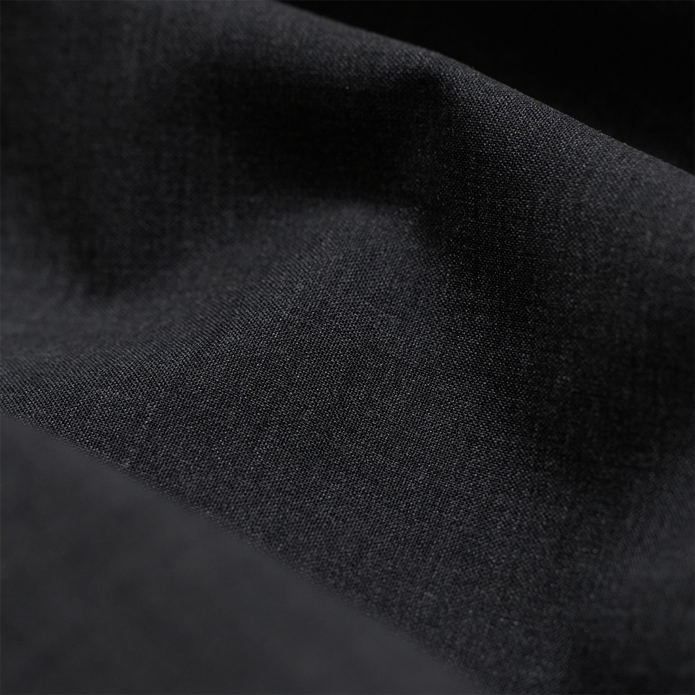 表地には、スーパー130’s梳毛ウールの糸のみを使用したウールトロピカルを使用しています。清涼感のあるさらりとした風合いと滑らかさを兼ね備え、真夏にも適した素材です。裏地にはナイロンの経糸に綿麻の緯糸を高密度に打ち込んだ平織生地を使用し、ナイロンの上品な光沢と綿麻のナチュラルな質感が調和し、麻特有のスラブ感も美しく表れています。接着には細かなドット状の劇脂を用いたボンディング加工を施しており、生地本来の風合いを損なうことなく仕立てています。