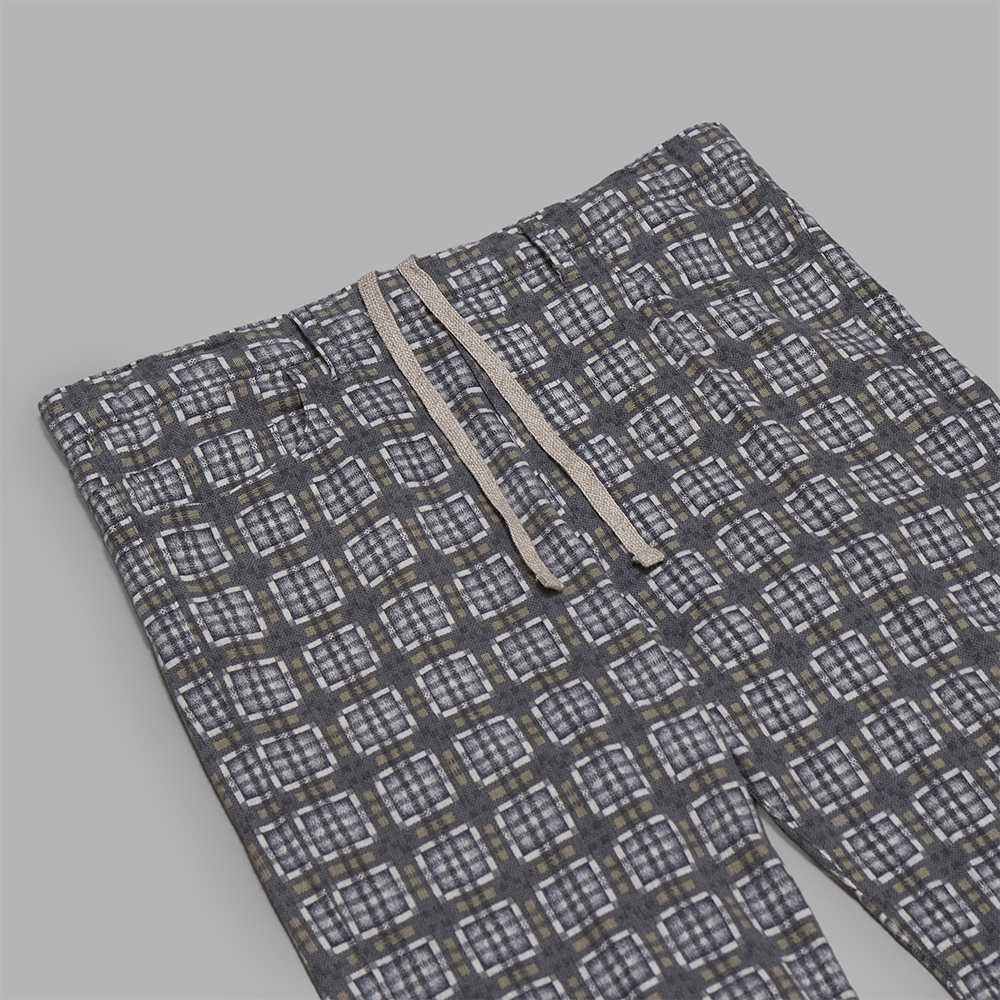 1940〜50年代のプリントネル素材をリファレンスに製作されたビスポーク生地を使用しています。当時のプリントは主に手作業によって施されており、生地表面を抜けて裏面にまでインクが付着する「裏抜け」が特徴であることから、繊細なチェック柄も崩れないように5版のハンドスクリーンプリントで丁寧に表現し、後起毛加工により柄の深みと独特の風合いを表現しています。