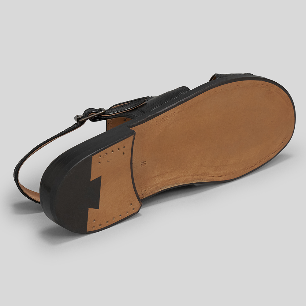 ダブルモンクストラップサンダルと同じ木型のSANDALOを用いて作製されています。つま先のアッパーがないオープントゥのデザインのため、捨て寸がほとんどなく、ノーズが短いことが特徴です。カジュアルで涼しげな印象で着用できます。