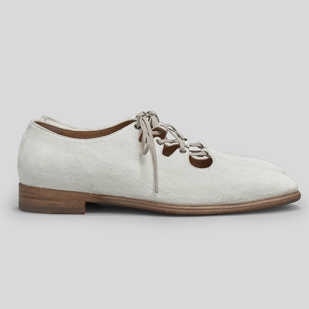トゥがすっきりと薄く、スクエア型の木型FUXIAを用いて作製されています。モデルはタンを排除した通気性の良さと、甲の開く装飾的なデザインが特徴的なギリーシューズです。