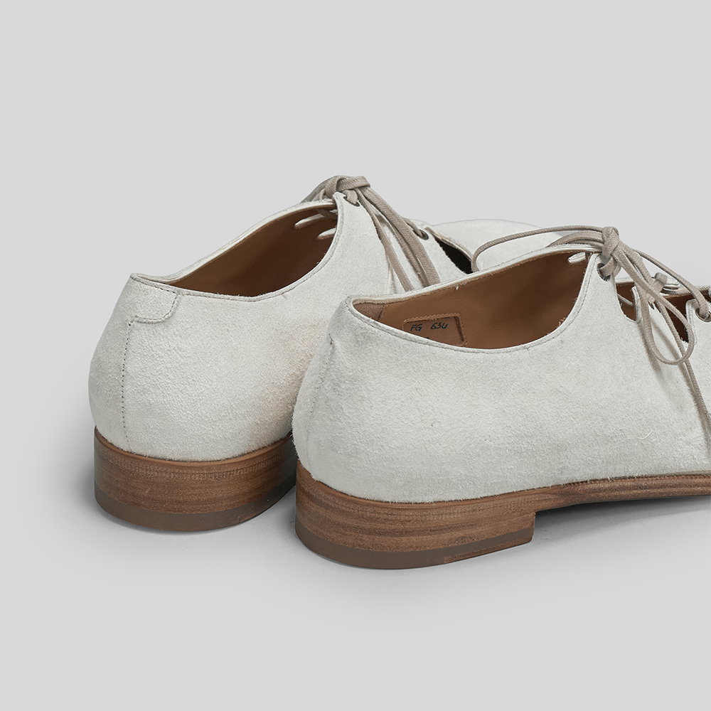 素材は、荒々しく長めの毛足で、ラフな表情が特徴的なホーススウェードをを使用しています。柔らかく、しっとりした素材感で、色は純白ではなく、ナチュラルなホワイトカラーで仕上げられていることにより、柔らかな雰囲気を演出してくれます。