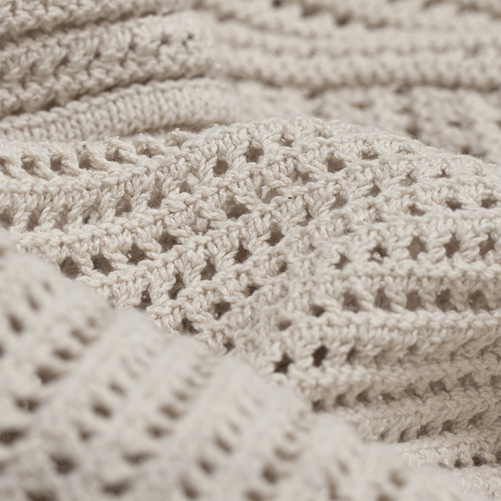 糸をかぎ針編みのようなメッシュ組織で編み上げた繊細で表情豊かな風合いが魅力のニットです。清涼感がありながらも、雰囲気のある着こなしをお楽しみいただけます。また、透け感を活かした、色物のカットソーとのレイヤードもお勧めです。