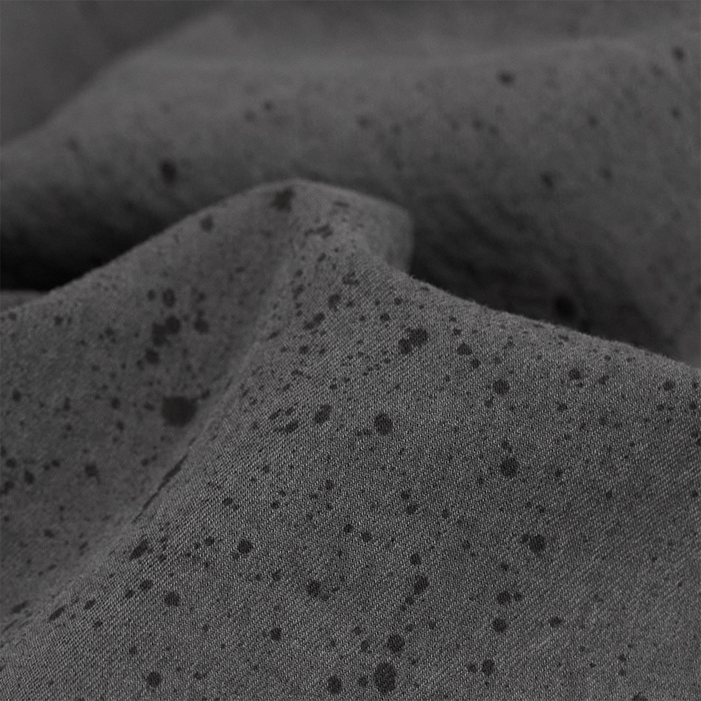 素材は、遠州産の強撚したボイル糸を使用した、ドライタッチのテキスタイルを使用しています。強撚することで着用したときに肌離れが良く、シャリ感のある風合いで、春夏に適した素材となっております。仕上げに、エンシェントダイ加工を施すことで、顔料のような激しさや、反応染料の均等な染め上がりとは異なる、ナチュラルな風合いの生地に仕上がっています。