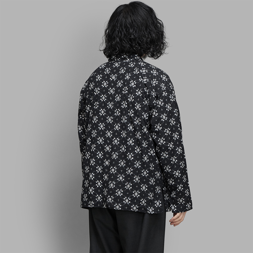 型は、1950年代のワークシャツと着物から着想を得た直線的なパターンを採用しています。全体的に程よくゆとりを持たせつつも、着丈をすっきりさせたサイズバランスで作製されたシャツジャケット型です。前立てのトップボタン部分はボタンではなく、フックのつく仕様です。前面の裾に配されたポケットは機能的に仕切られているだけでなく、デザイン性も兼ね備えています。
