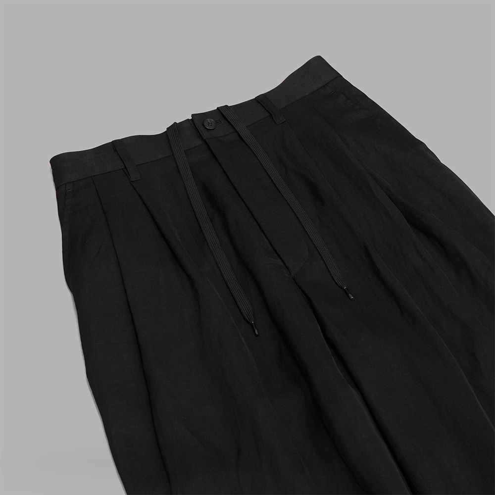 型は、股上やワタリ幅など、全体的に程よくゆったりとしたサイズバランスで製作されたツータックトラウザーズです。バック部分にはイージー仕様を採用し、上品な印象が残るよう全体のバランスや各ディテールを調整しています。前立てはジップフライで、裏地はありません。