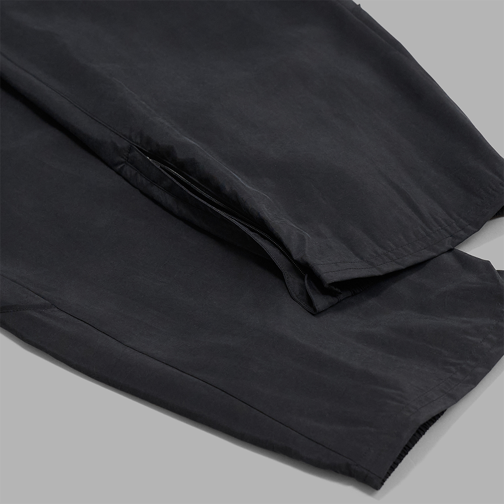 型は、ゆったりとしたストレートに近いシルエットで製作されたイージー仕様のトラックパンツです。股上はやや深くし、程良くリラックス感を持たせ、後ろの裾口のみゴム仕様でミニマルな印象に仕上げています。また、裾口の内側はファスナーが付いており、開閉位置を調整することで、足元に変化をつけることができます。前立ては、トップボタンは無いジップフライの仕様で、裏地はありません。