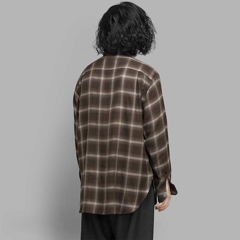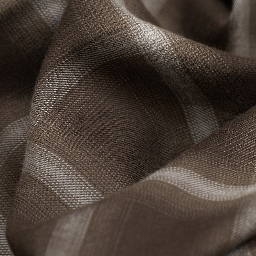 素材は、ふんわりと柔らかなヴィスコース/リヨセルの混紡糸を使用しています。レーヨンとは違う独特の光沢感、落ち感が特徴の強度のある生地です。空気の渦を利用して糸を紡ぐ最新の技術を使用した、MVS紡績をしたオリジナルのオンブレチェックです。最終工程にピーチ加工を施すことで、より一層肌触りの良いタッチに仕上げています。