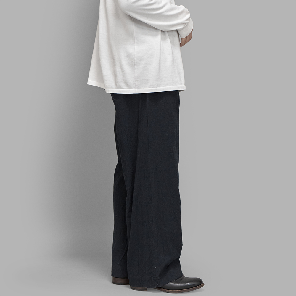 程よいネップ感のあるコットン・シルクの薄手の生地を使用しています。重く感じすぎない絶妙な黒のトーンは、やや薄めの乾いたような色味で春夏のスタイルでも合わせやすい印象です。