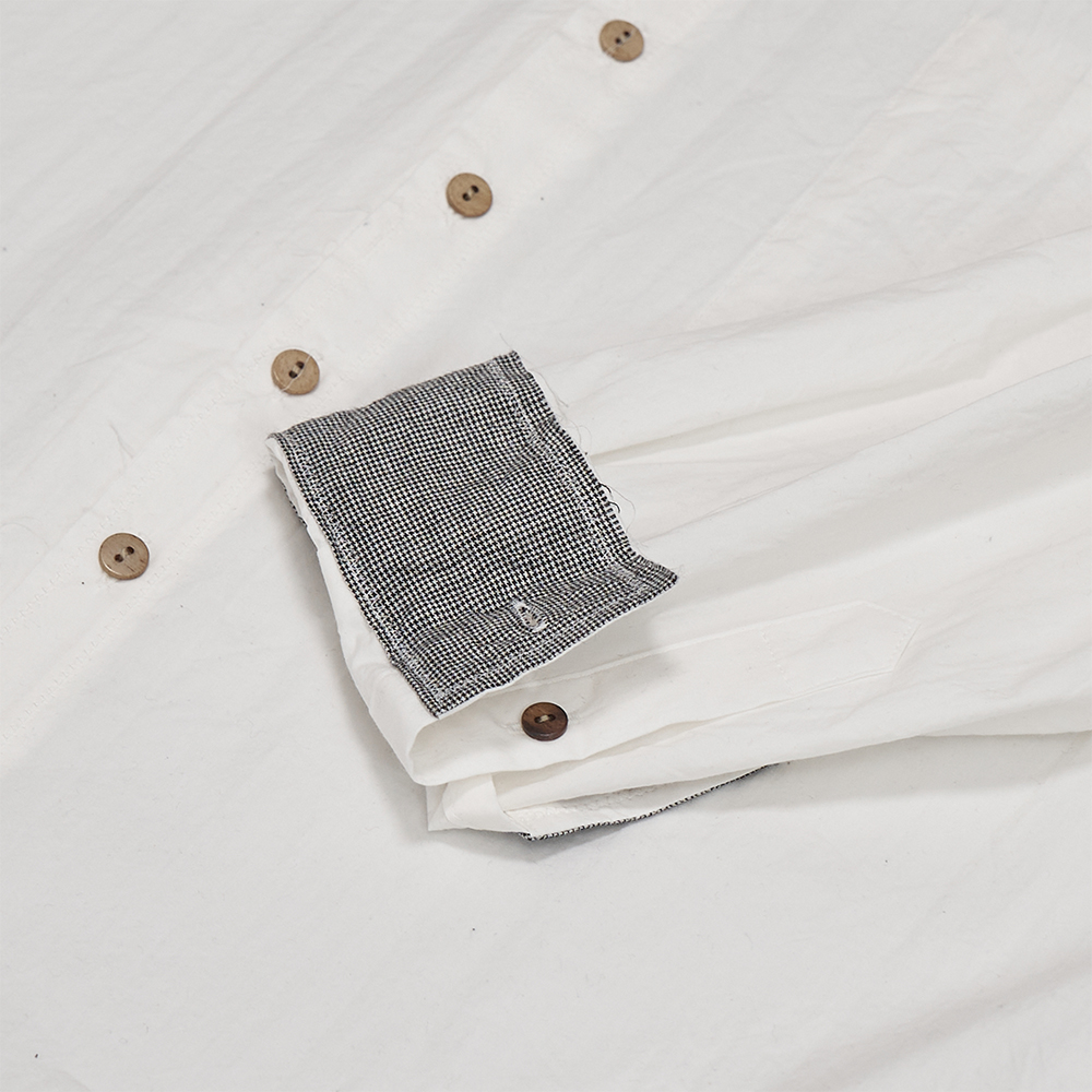 また、胸ポケットは内側に付きます。袖裏にはマイクロハウンドトゥース柄を配して、袖裏の汚れを目立たなくすることや袖捲りした際のアクセントとして活用できる仕様です。