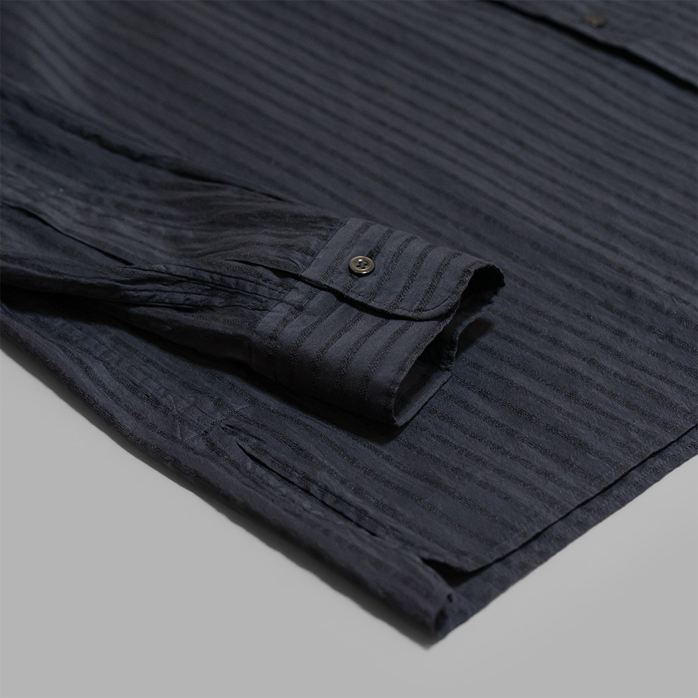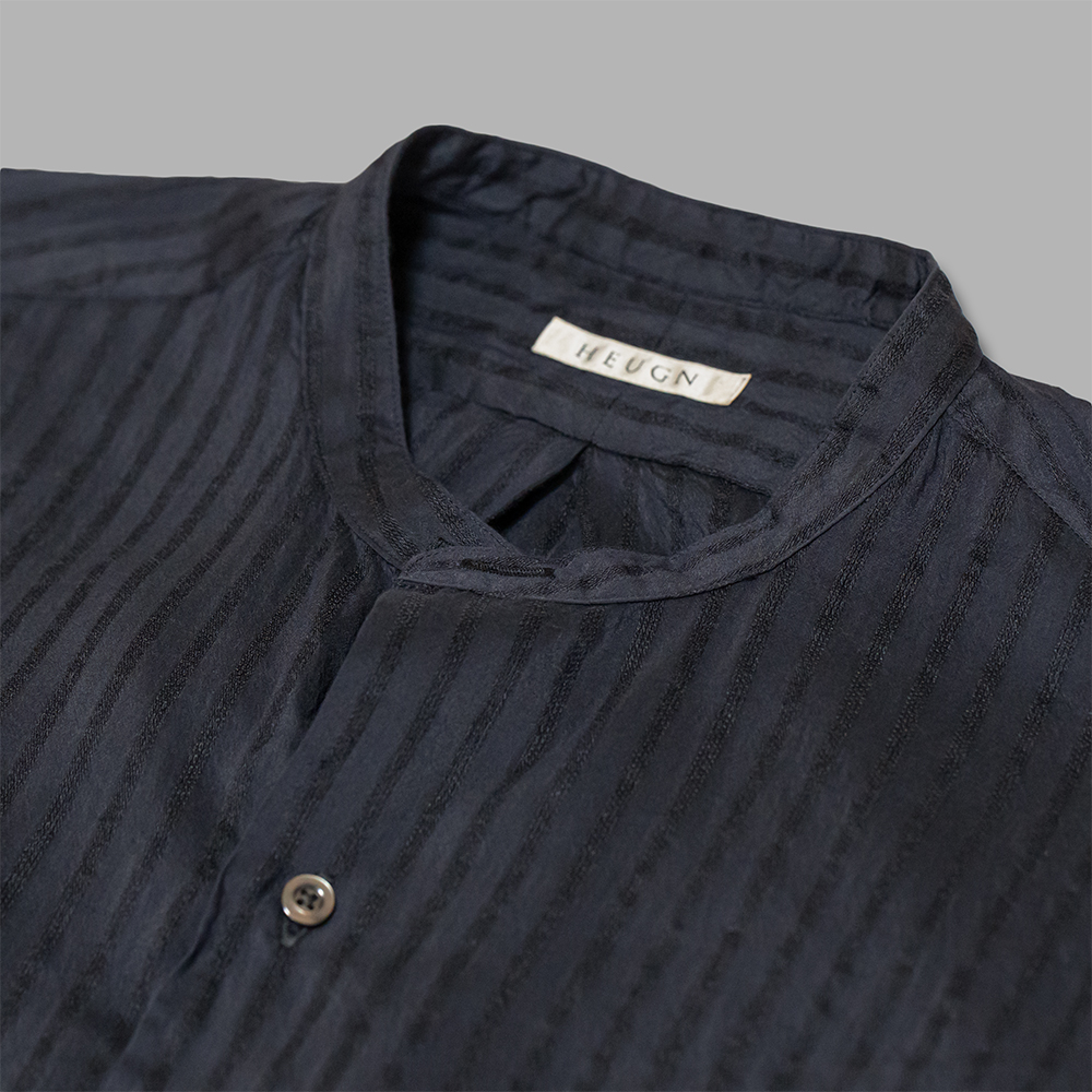 型は1920年代のフランスのイブニングシャツをベースに新しいシルエットのバンドカラーシャツを再構築。サイズバランスは肩や身頃を広めにとってゆったりしたシルエットに仕上げています。裾はフラットでスッキリした印象に仕上げ、サイドにスリットを入れて動きをもたせています。