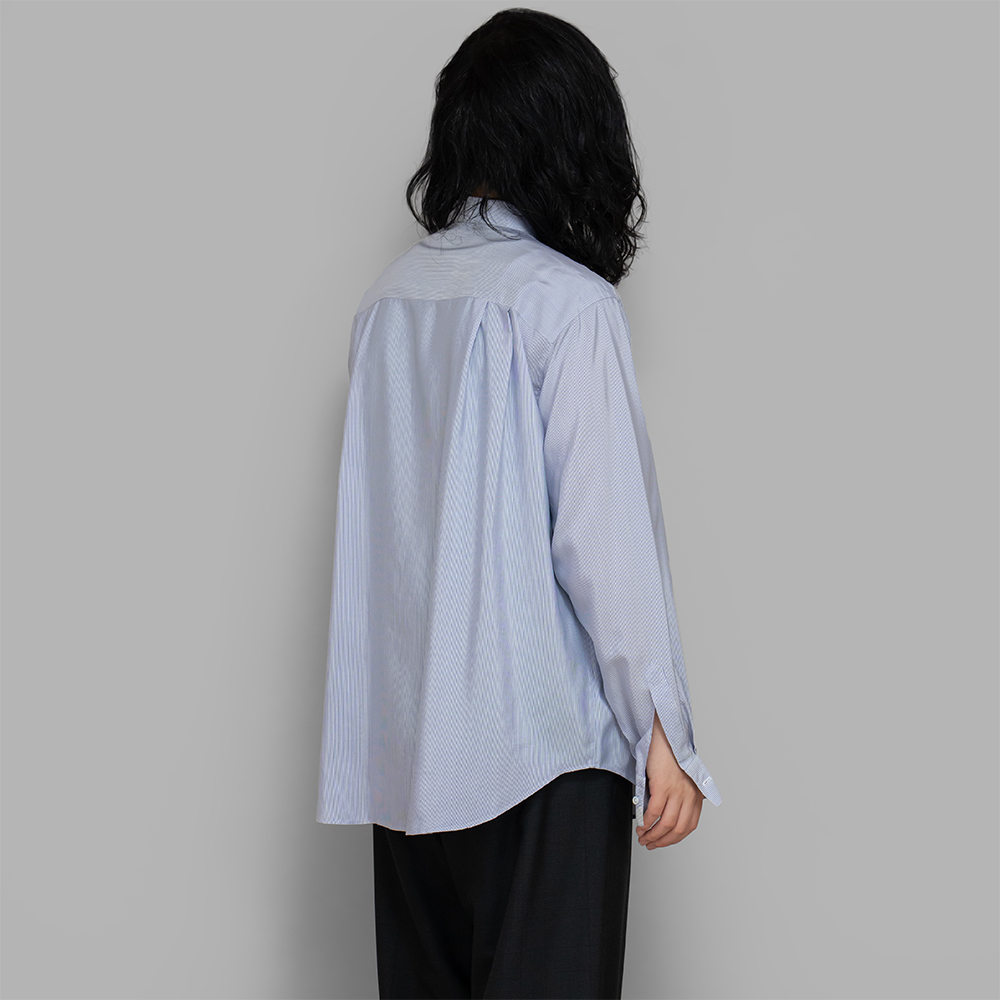 型は、80’sのDC古着よりインスピレーションを受け、スポーティに着用することの出来る、オーバーサイズのレギュラーシャツです。身頃が広く、裾のラウンドも浅いため、ゆったりした雰囲気で着用できます。上品な印象を受ける小ぶりのボタンもポイントで、細部までデザイナーの拘りが感じられます。