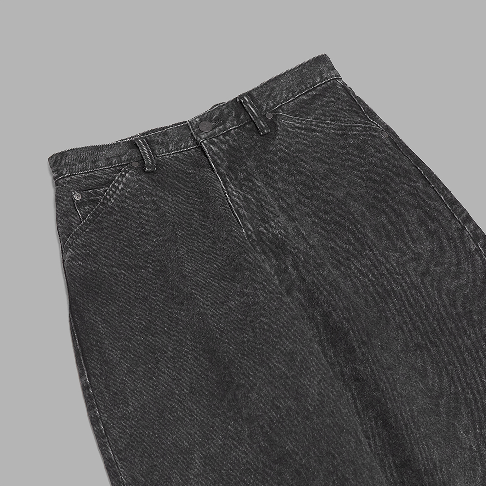 一度限りの展開として、26SSシーズンでは、ブランド別注のセルビッチデニムのリジットではなく、1990年代のデニムをリプロダクトした14ozのオープンエンド糸のデニムを使用しています。通常は行わない製品加工を施している点も特徴です。加工は、タテ落ちせず、全体的に波打つような表情でフェードする仕上がりです。