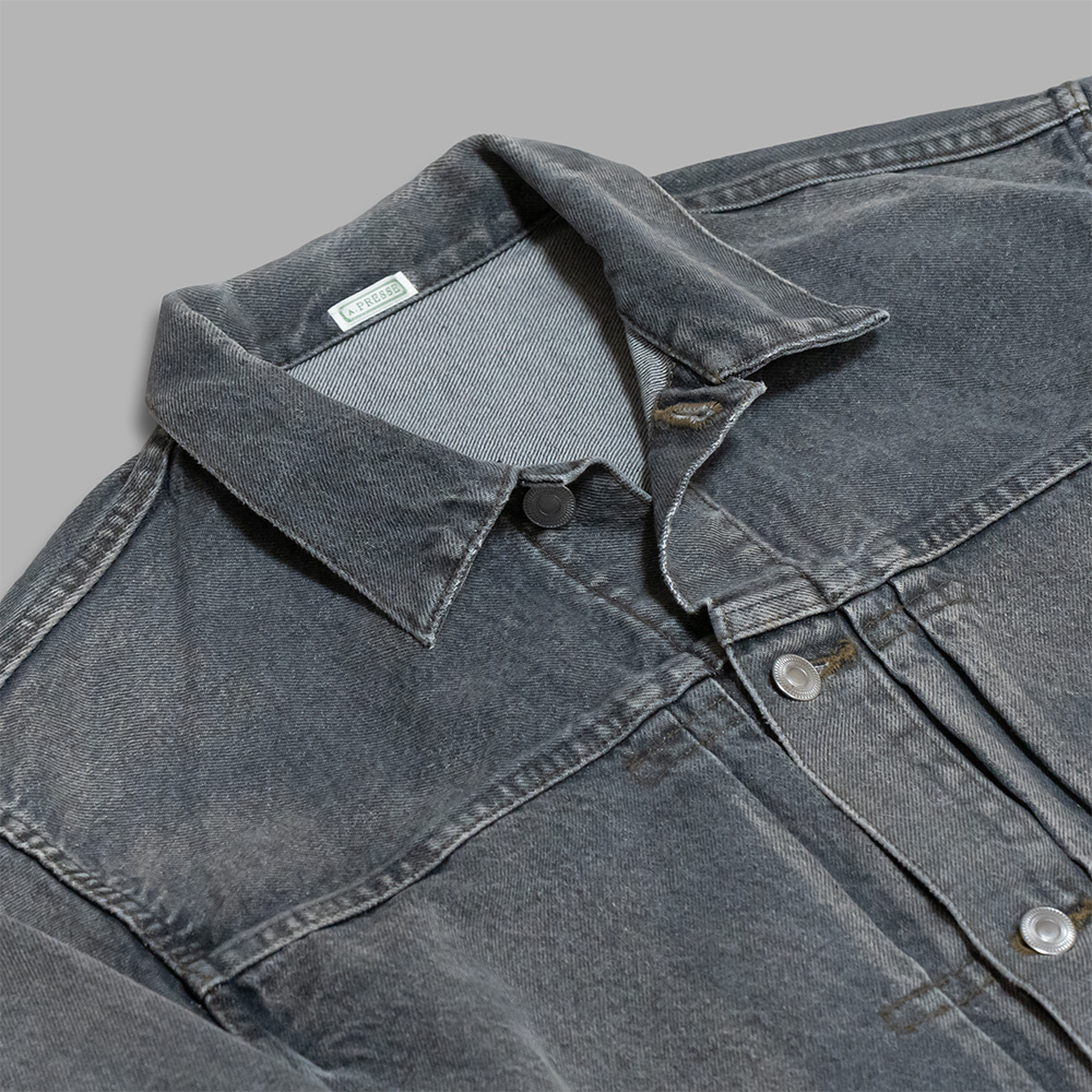 経糸緯糸ともに空紡ストレート糸を使用た14オンスデニムで、芯がややグレーに染まっているブラックが抜けにくい古着のデニムをイメージにして作製されています。