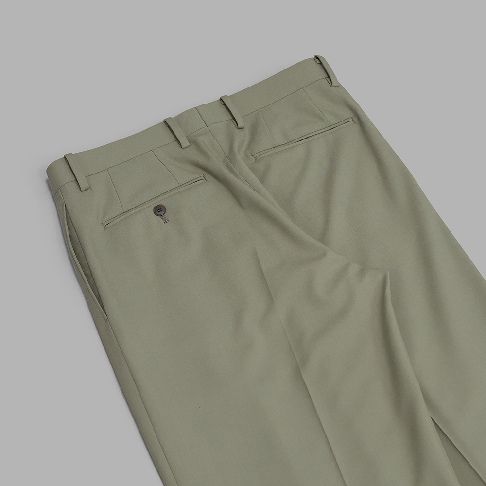 型は、腰回りにツータックを入れ、ゆとりのある着用感に仕上げたトラウザーです。わたり幅も太めに設定し、膝下からわずかにテーパードをかけています。前立てはジップフライ仕様で、裏地は半裏仕立てです。