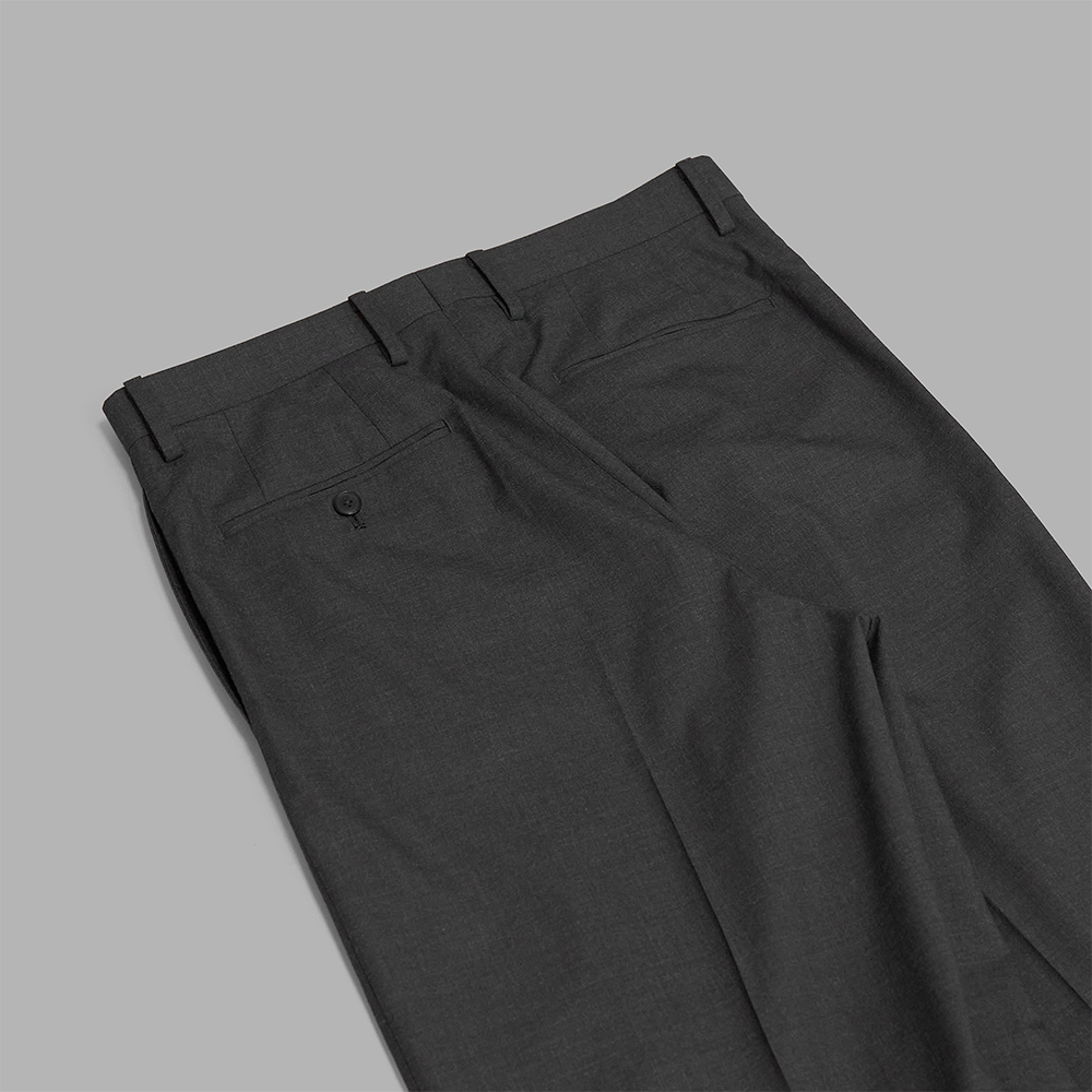 型は、腰回りにツータックを入れ、ゆとりのある着用感に仕上げたトラウザーです。わたり幅も太めに設定し、膝下からわずかにテーパードをかけています。前立てはジップフライ仕様で、裏地は半裏仕立てです。