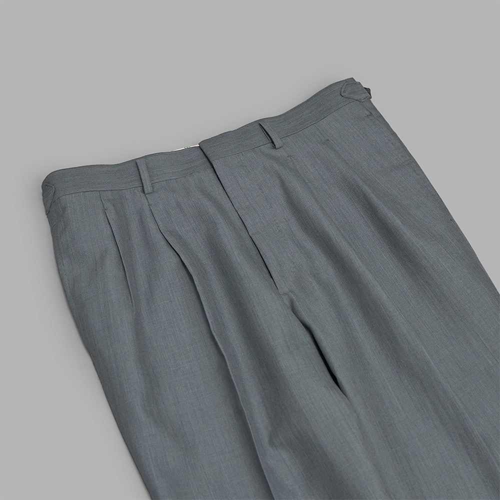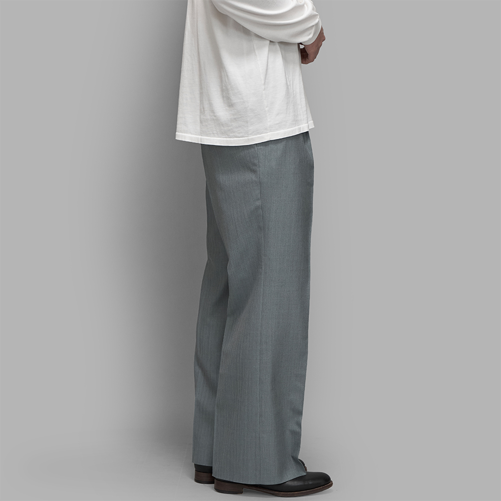 型は、一般的なフレアパンツに比べ、膝下から裾にかけて、微かに広がりを感じられる、微フレアのシルエットになります。また、ツータックにすることで、腰回りにもゆとりが生まれ、全体的にリラックス感のあるシルエットに仕上げています。腰にはサイドアジャスターが付き、前立てはジップフライで中は半裏の仕様です。