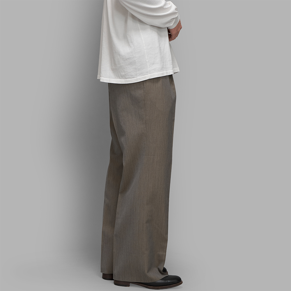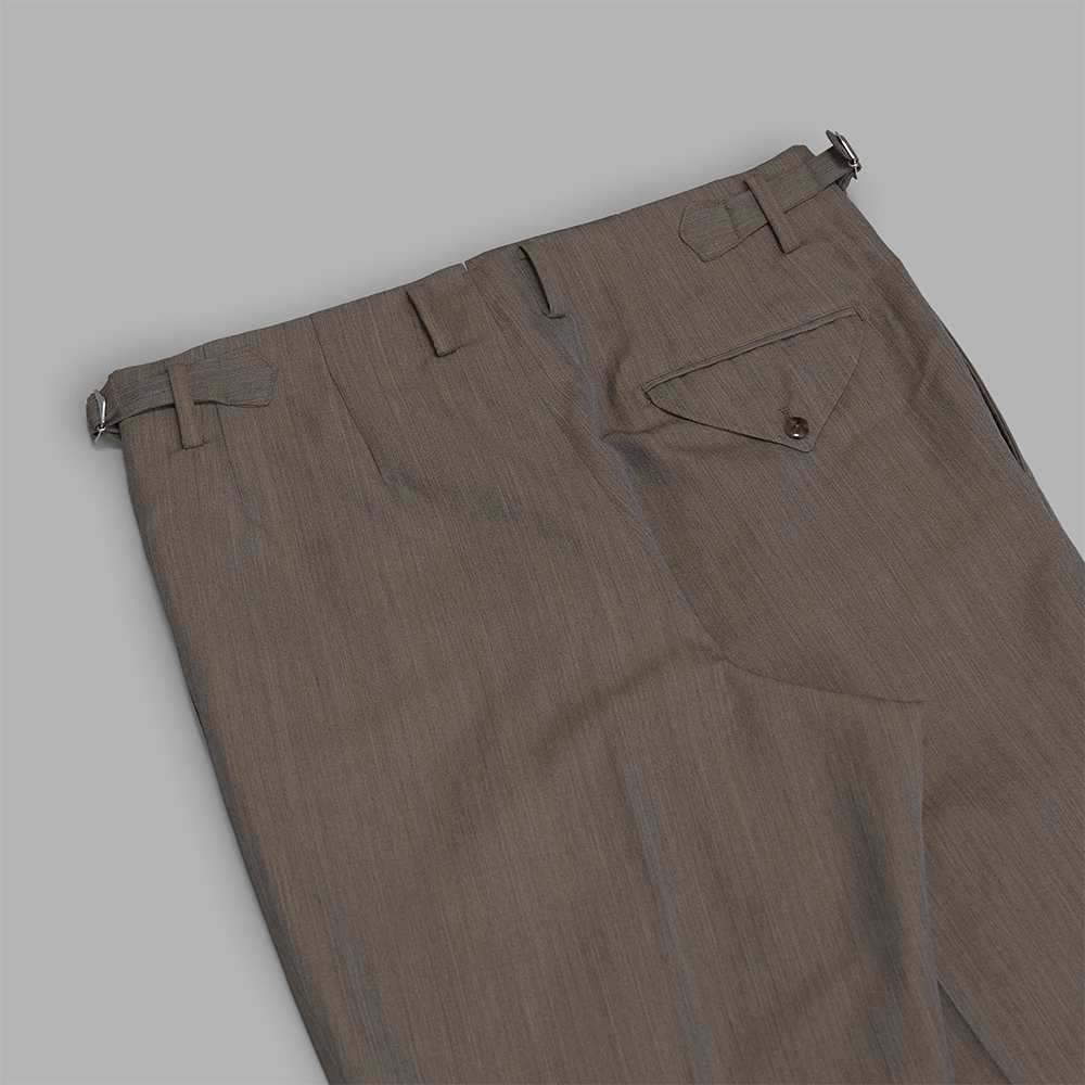 型は、一般的なフレアパンツに比べ、膝下から裾にかけて、微かに広がりを感じられる、微フレアのシルエットになります。また、ツータックにすることで、腰回りにもゆとりが生まれ、全体的にリラックス感のあるシルエットに仕上げています。腰にはサイドアジャスターが付き、前立てはジップフライで中は半裏の仕様です。