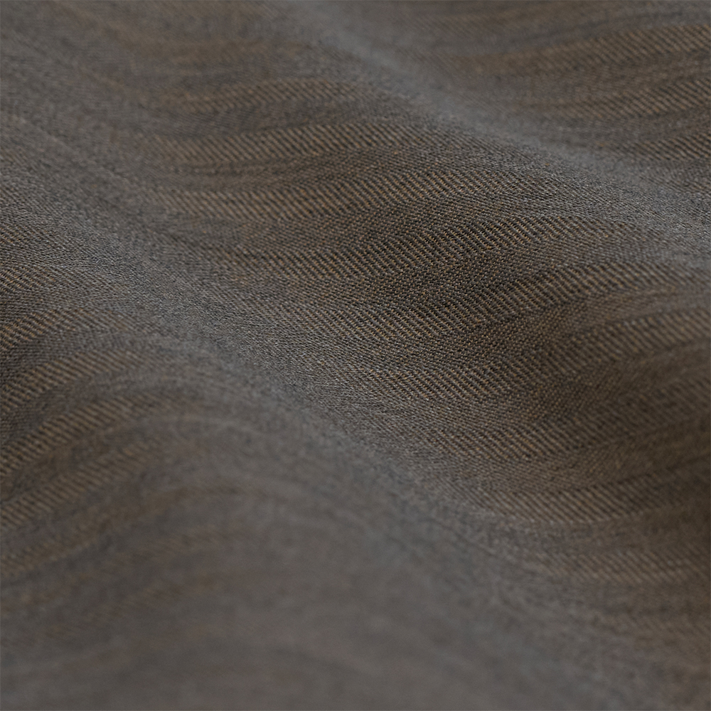 素材は、ウールとモヘアを使用しています。程よいハリとサラッとした質感、上品な光沢によるドレープが特徴的な素材となっています。異なる配色の糸を組み合わせ、ヘリンボーン柄で織り上げることで、奥行きと同ブランドらしい独特なニュアンスカラーの生地に仕上がっています。