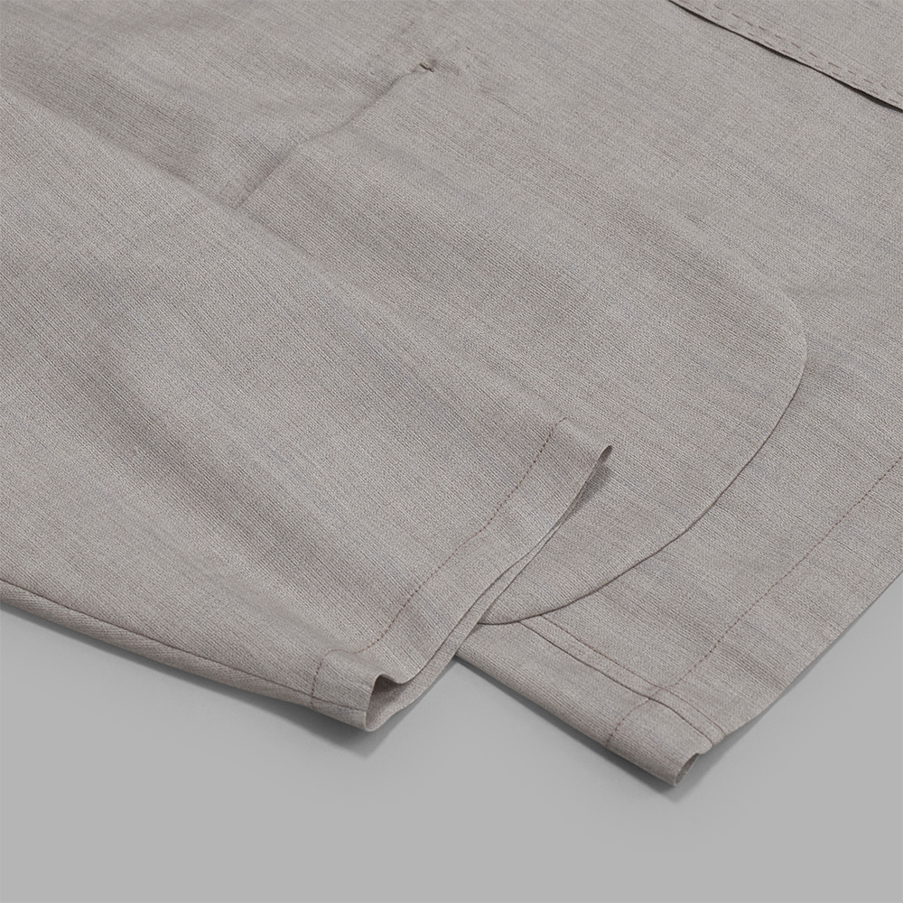 ラペルから前端にかけて施された二重のハンドステッチや手まつりの力布、ボタンホールに至るまで随所に手仕事が施され、味わいのある仕上がりです。薄く軽やかな着心地ながら、細部の作り込みや奥行きのある生地感が際立つ一着です。同生地のボトムスも展開されており、セットアップであわせることもできます。