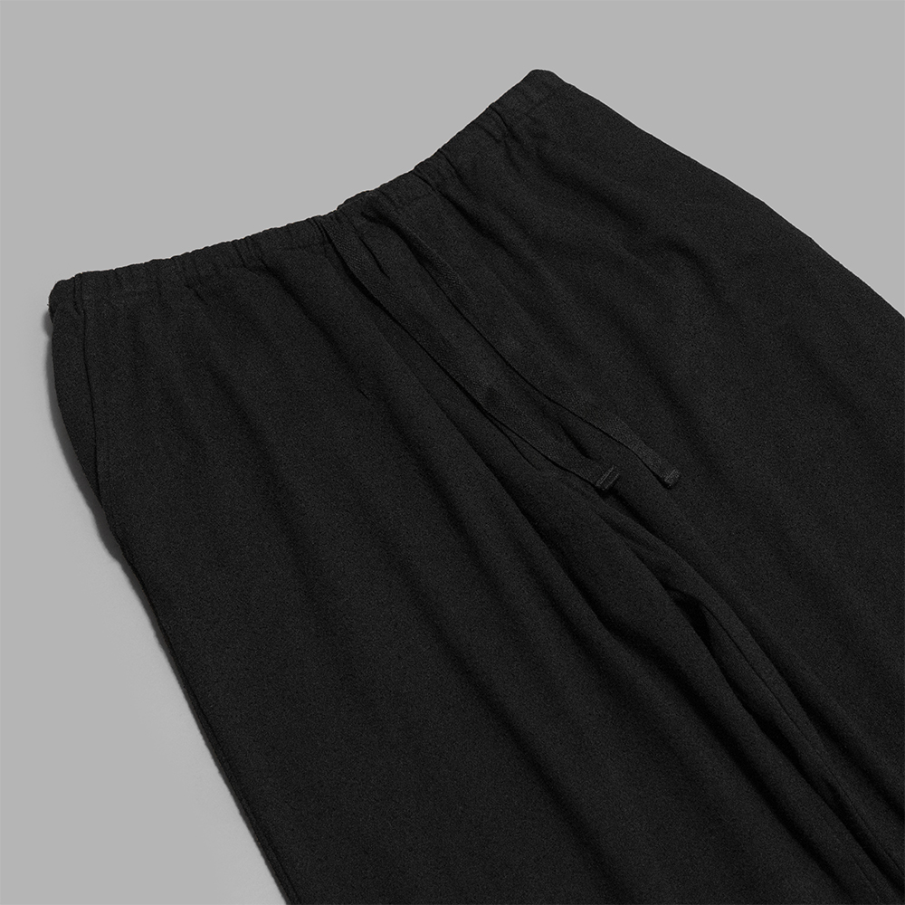 型は、ゆったりしたシルエットの裾リブ仕様のドローストリングパンツです。前立てはジップフライで、ウエストはドローコードだけではなく、ゴムも通しフィット感を高めています。