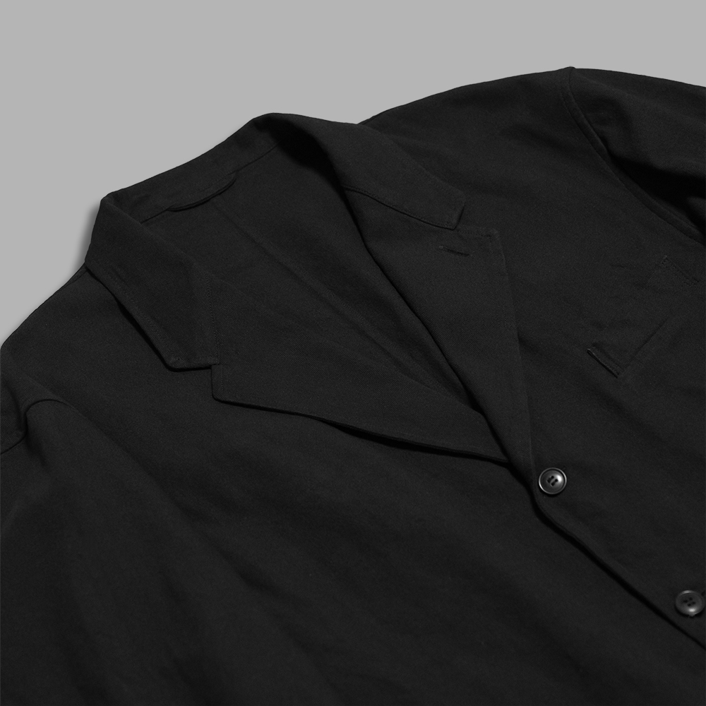 型は、ゆったりしたサイズ感で作製されたテーラーラペルのジャケットです。中は裏地の付かない一重の仕様で、左右の見返し部分に内ポケットを1つずつ付けています。