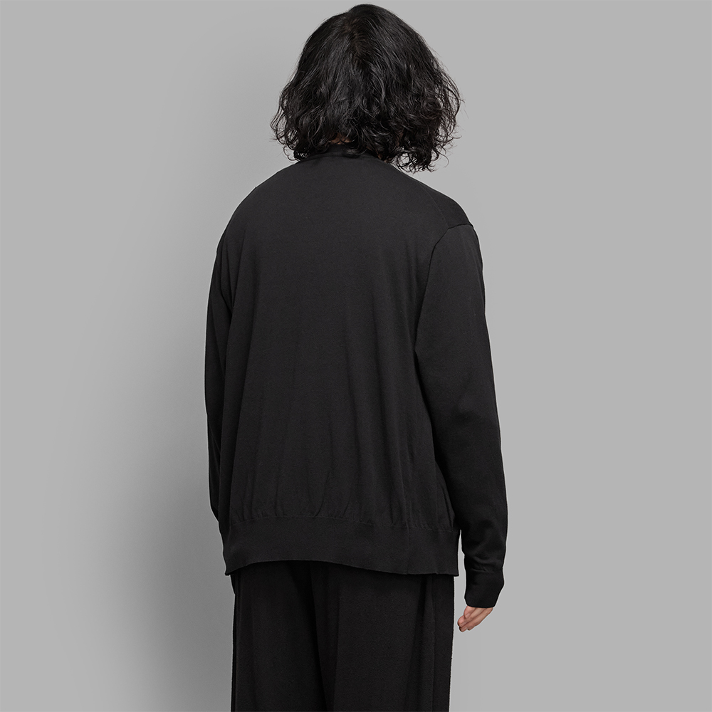 25SSから継続展開されている、軽くてドライな糸で編み立てた18Gのニットカーディガンです。編み地に若干のムラ感があり、ハイゲージでも整い過ぎていない印象にしています。