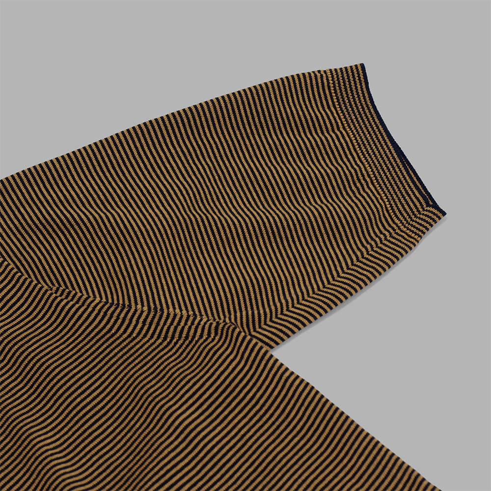 素材は、薄手のハイゲージコットンニットを使用しています。滑らかでドライタッチな質感が特徴で、さらっとした素材感により、気温の高い時期でも違和感なく着用することが可能です。