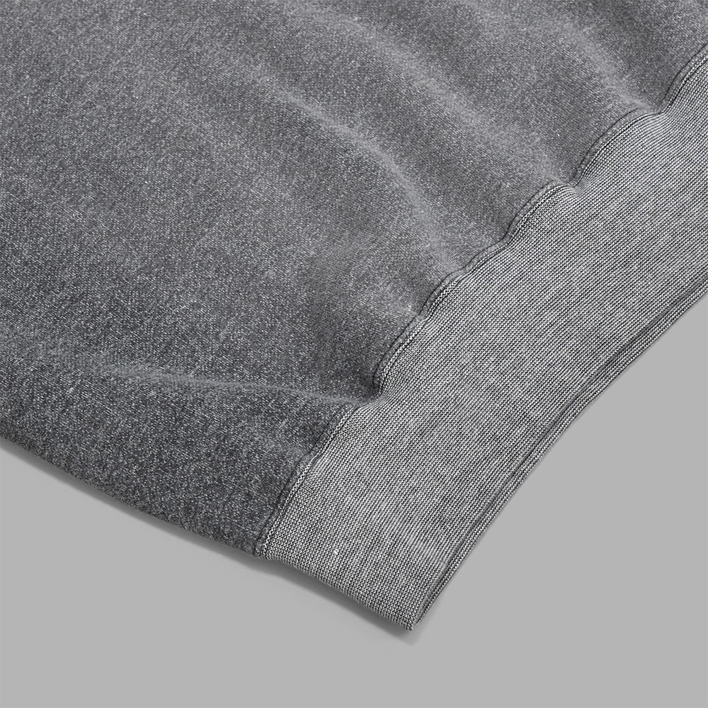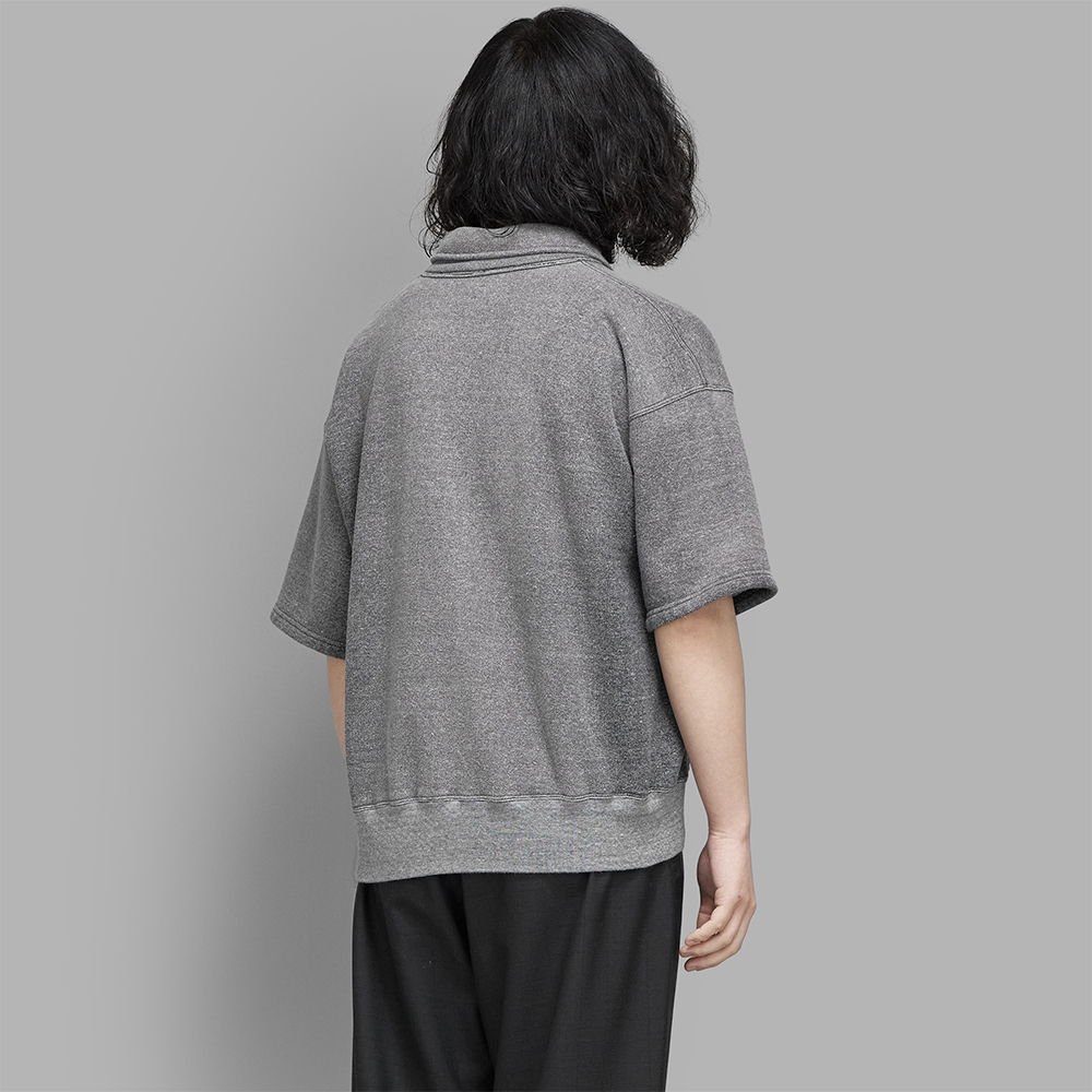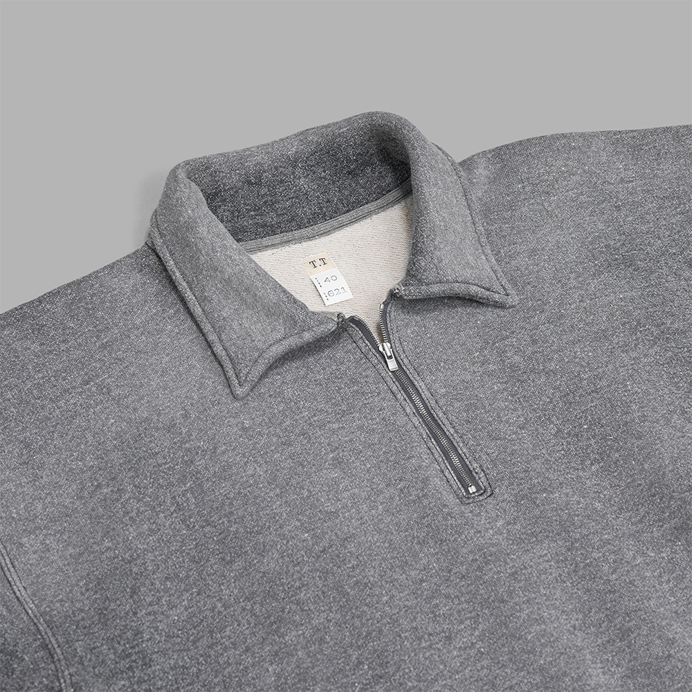 型は身頃にゆとりを持たせ、着丈をスッキリとさせたボックスシルエットに整えたハーフジップのスウェットです。衿のデザインは、シャツのような二枚仕立てではなく、一枚仕立てで効率的に作られており、洗い後には自然なヨレ感が生まれるように設計しています。1920年代によく見られたアールデコ調の筋刻印を施したファスナー引手は、オリジナルで作成しており、細部にまで拘りを感じる作りです。