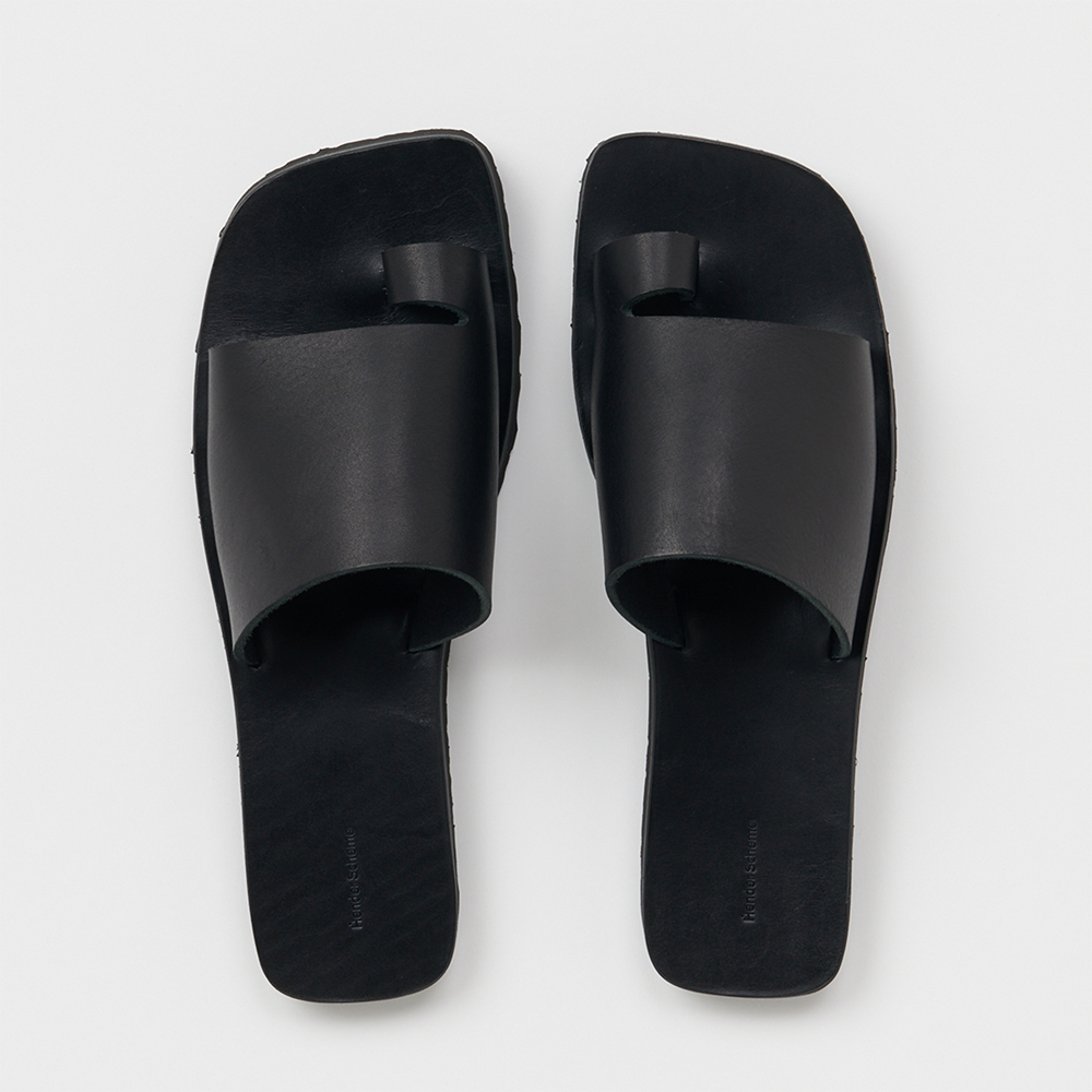 型はミニマルなオブリークトゥ形状のサンダルですが、ミッドソールとアウトソールは底面のゲージを数ミリ単位で内外差をつけて底貼りを行っているため、手間はかかりますが、立体的で丸みのあるフォルムで仕上げています。それにより、フィティングも包み込むような感覚を感じてもらうことができます。